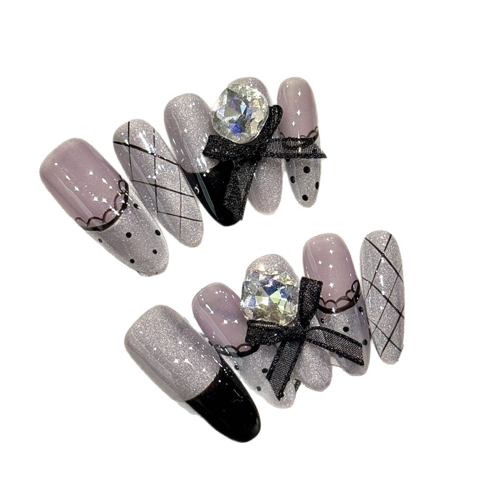 艺禾美甲 菱格小香风猫眼法式紫色韵味波点蕾丝边紫色迷情穿戴甲