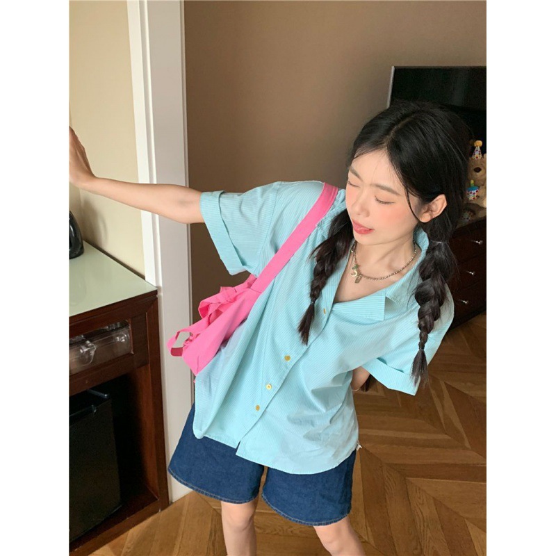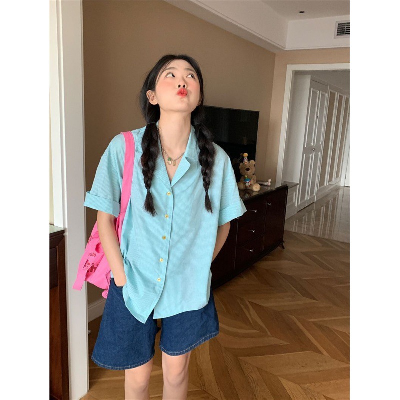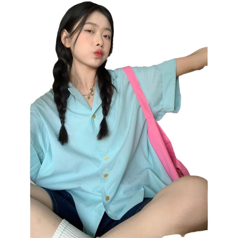 日系少女复古港味叠穿衬衫女短袖夏季新款韩版宽松条纹衬衣学生潮