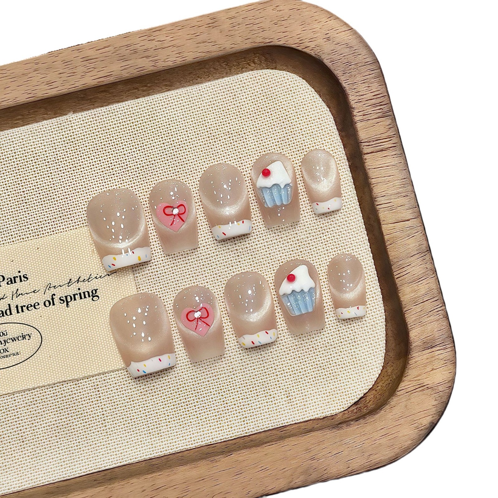艺禾美甲 法式微笑猫眼奶昔蛋糕款可爱蝴蝶结个性短款手工穿戴甲