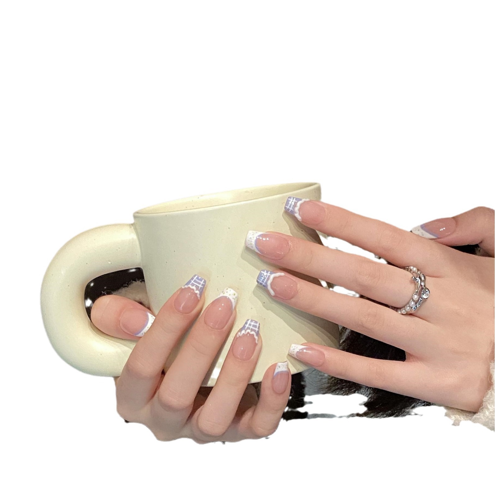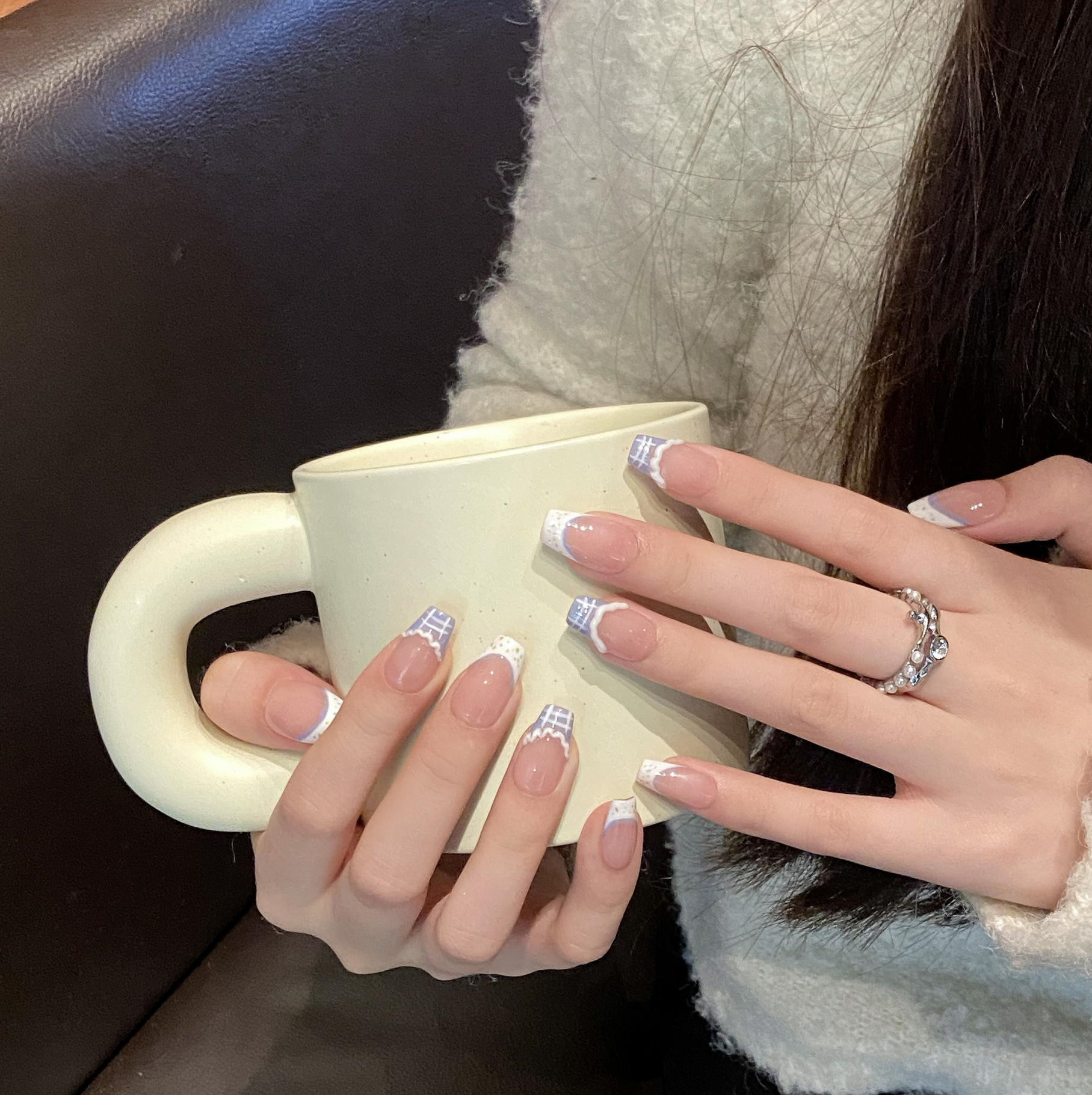 【实拍】春日美甲穿戴甲手工甲片手绘格子法式百搭可拆卸甲片批发