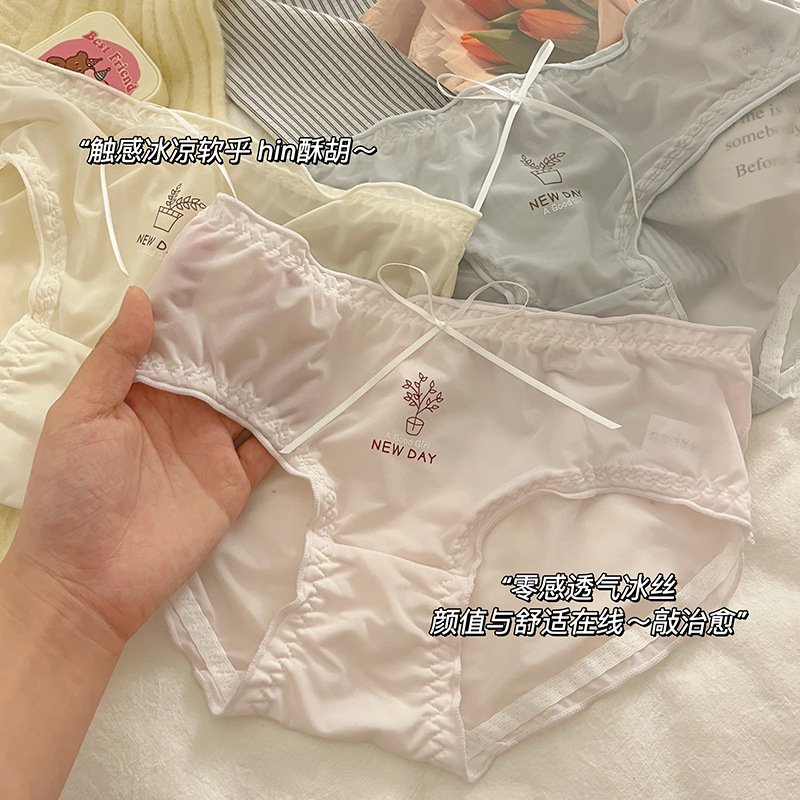 清新纯欲少女木耳边蕾丝拼接三角内裤包臀弹力女士中腰蝴蝶结内裤