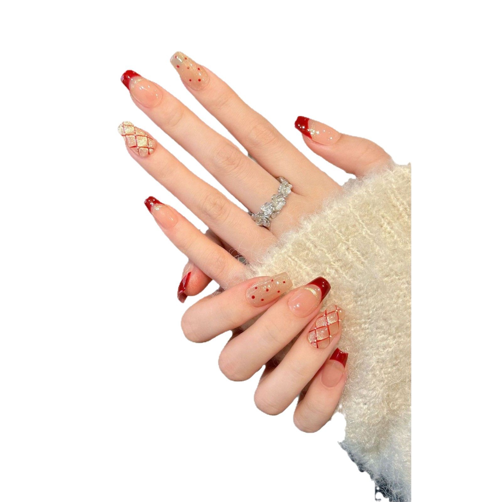 艺禾 秋冬新年款红色波点猫眼格纹法式高级感日常手工穿戴美甲