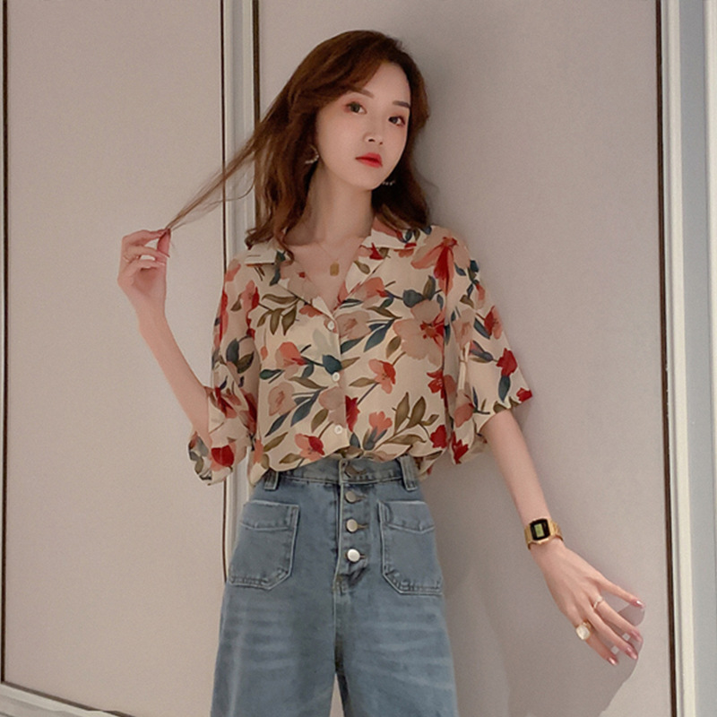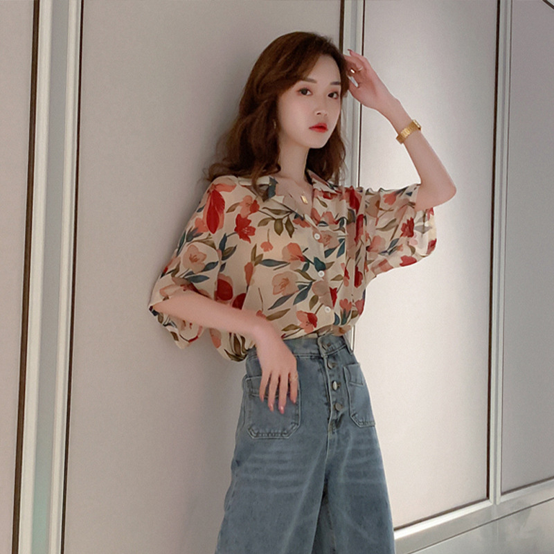设计感小众轻熟雪纺气质有垂感衬衫女印花上衣洋气韩版衬衣女夏季
