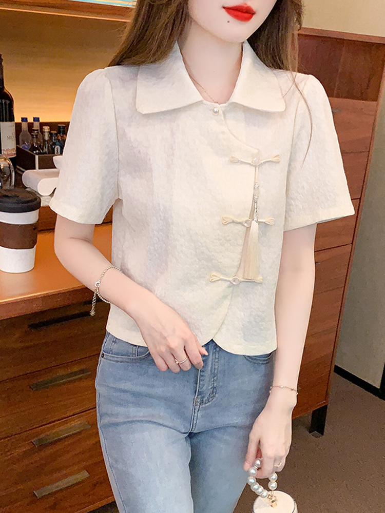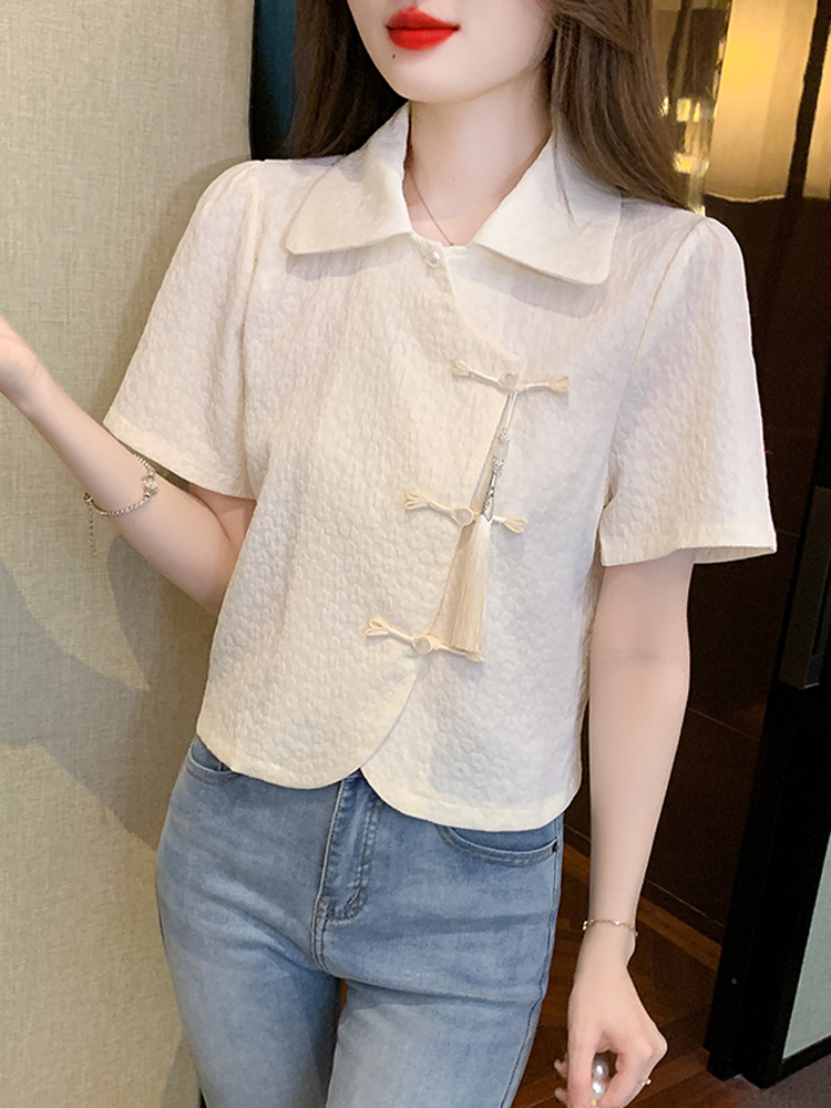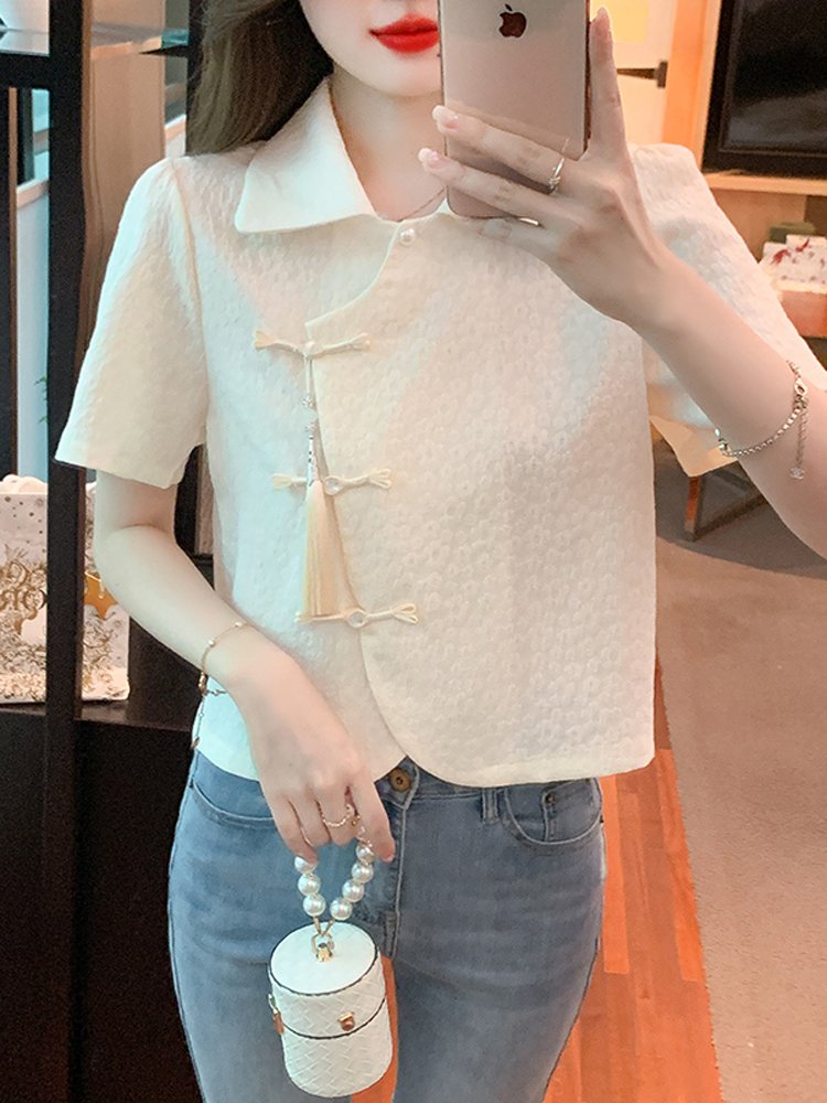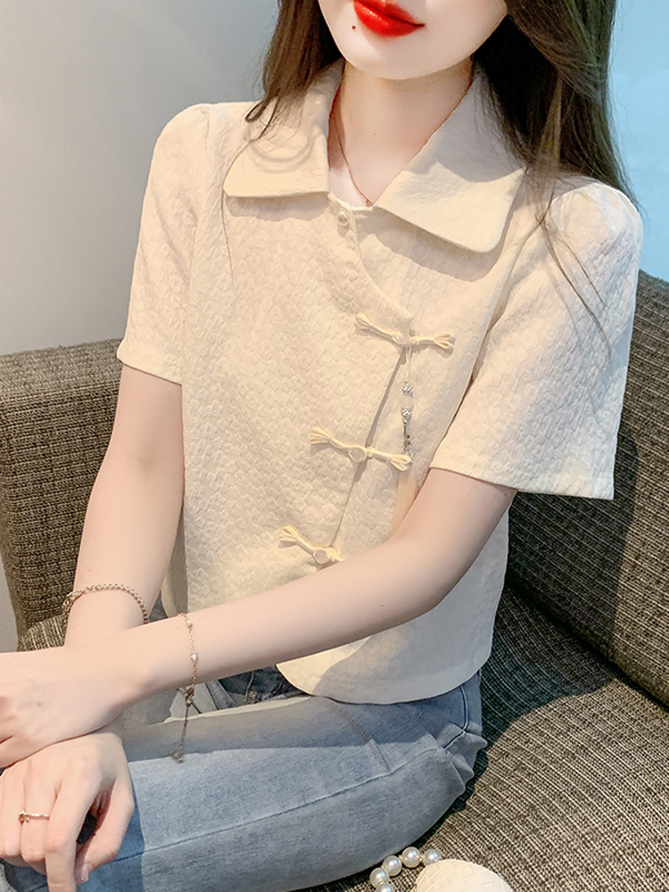 新中式国风盘扣雪纺上衣女夏季设计感小众小个子Polo领短袖衬衫潮