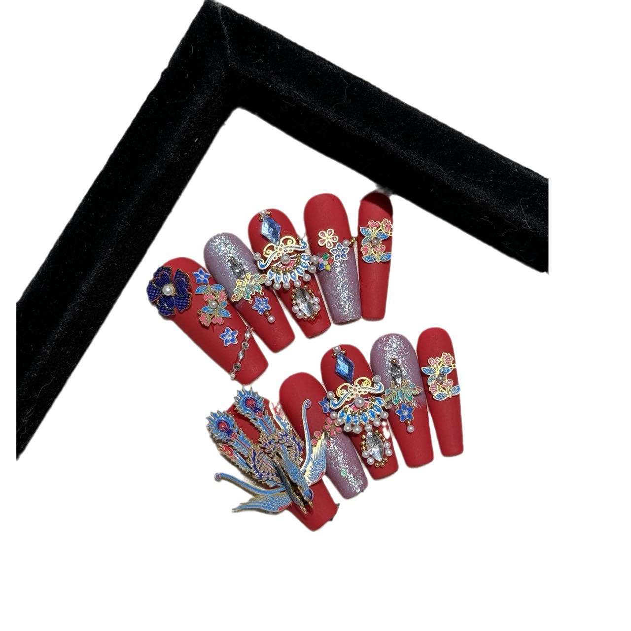 【原创实拍】十里红妆凤冠霞帔穿戴甲喜庆中国红立体凤凰孔雀蓝婚