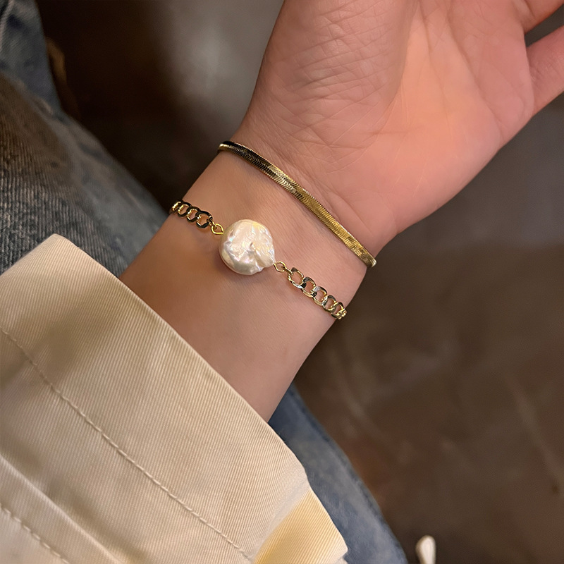 个性轻奢双层叠戴天然异形珍珠手链 ins气质小众设计嘻哈链条手饰