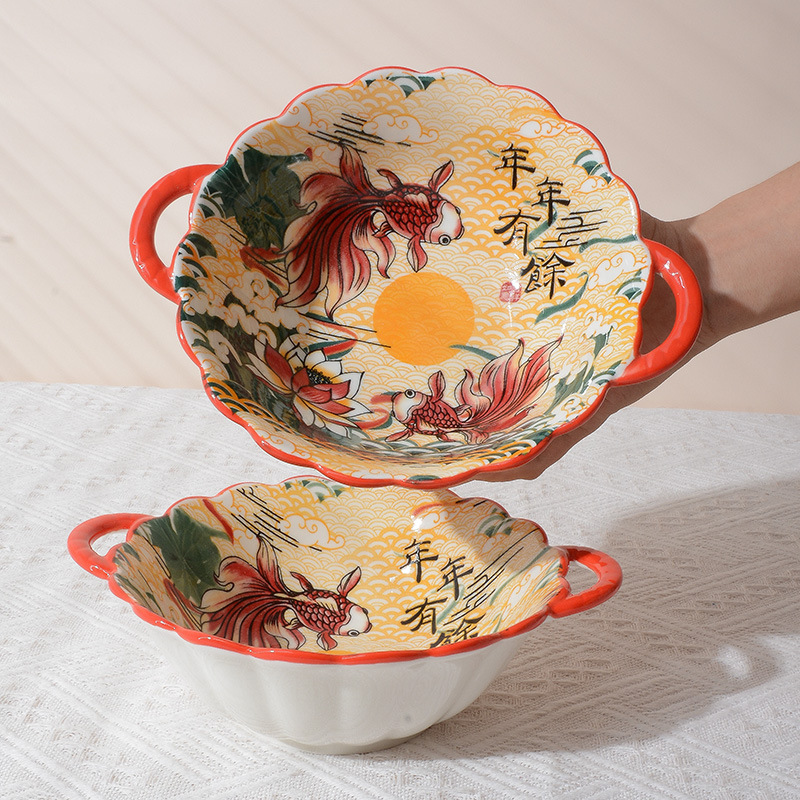 特别好看的饭碗餐具家用小碗陶瓷高级感中式双耳碗年年有余甜品碗