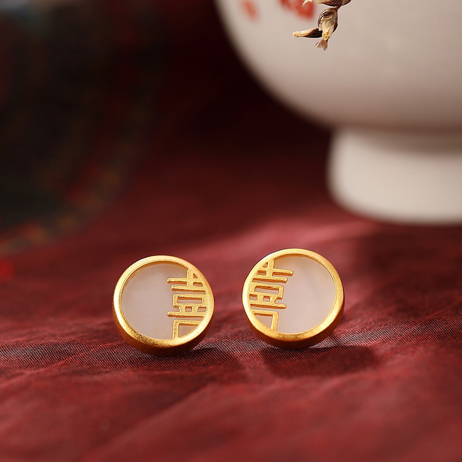 新款喜字耳钉女中国风本命年纯银古法金和田玉耳饰高级感耳环