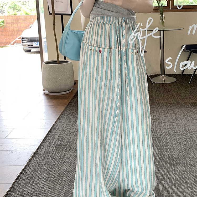 松紧腰抽绳条纹阔腿休闲裤女夏季新款韩版时尚百搭高腰长裤潮