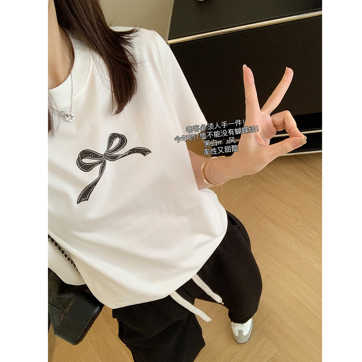 朵妮自制甜酷手绘蝴蝶结印花宽松短袖女春季新款减龄气质显瘦T恤