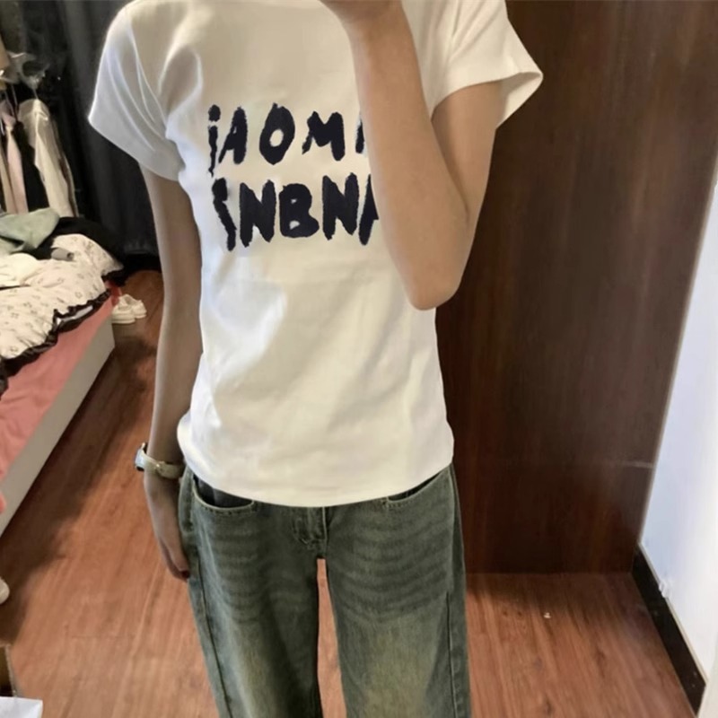 美式复古字母正肩短袖t恤设计感小众显瘦辣妹修身休闲闺蜜上衣潮