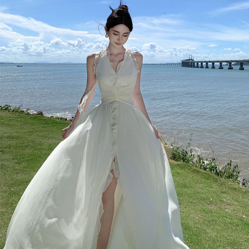 法式高级感超好看仙气质雪纺挂脖连衣裙仙女夏季海边度假风长裙子
