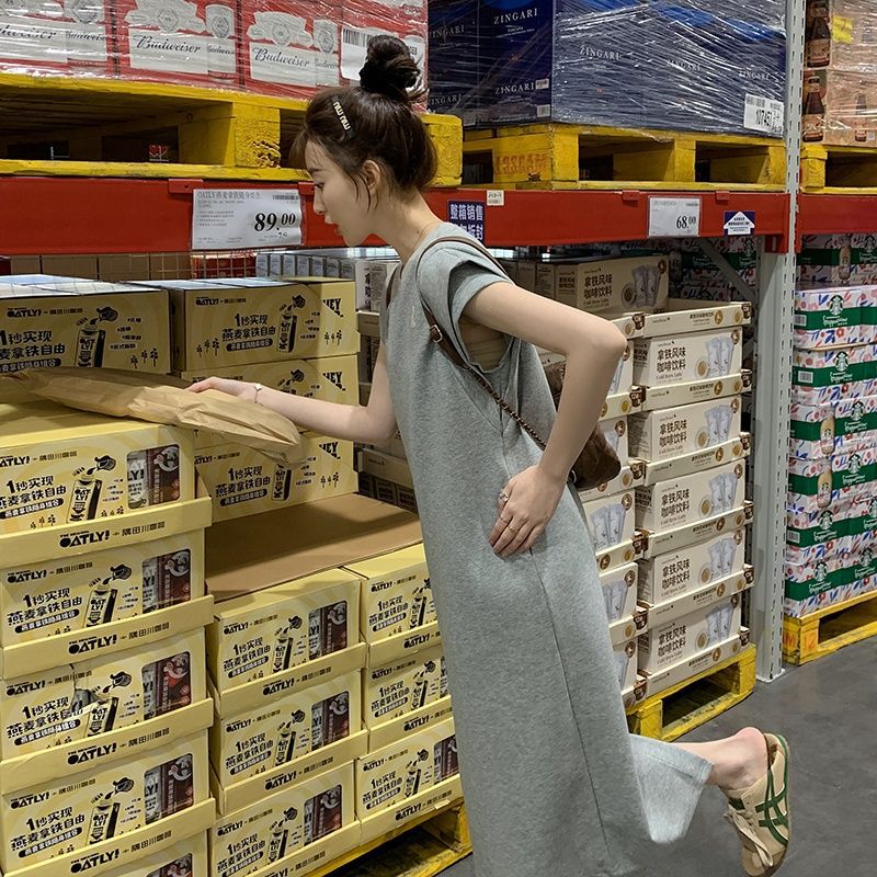 设计灰色刺绣字母拼接卫衣裙新款连衣裙夏季宽松开叉休闲长裙