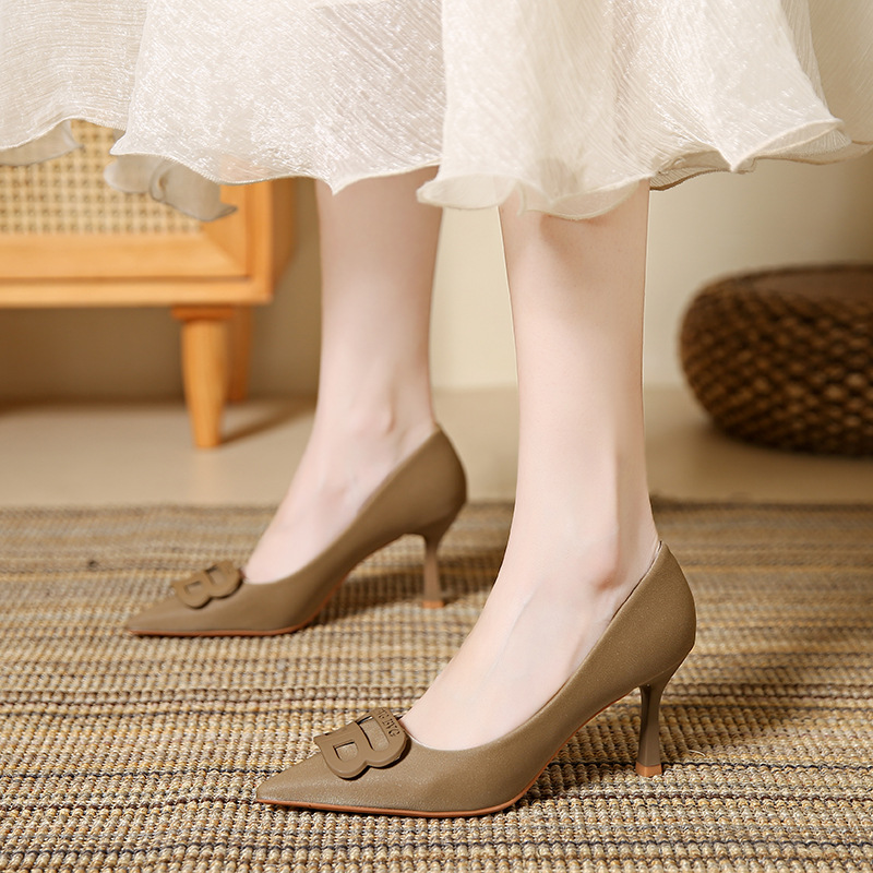 法式裸色真皮金属搭扣细跟高跟鞋新款软皮通勤职业高跟鞋女