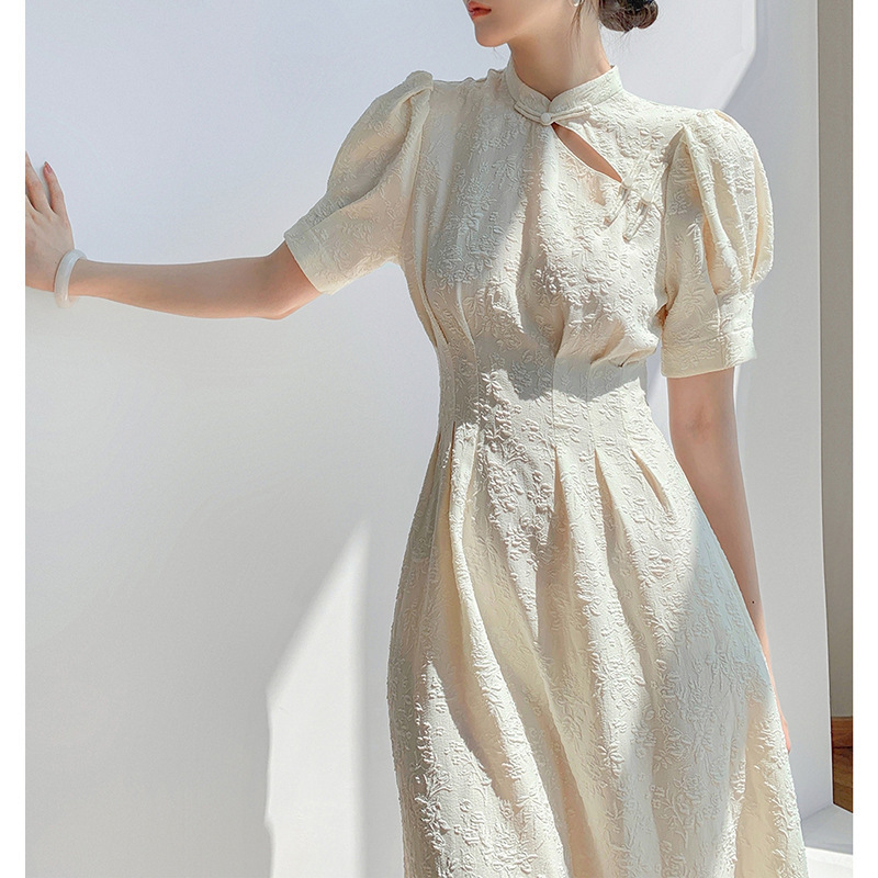 复古改良白色旗袍裙女夏季新款法式高级感提花连衣裙女长裙