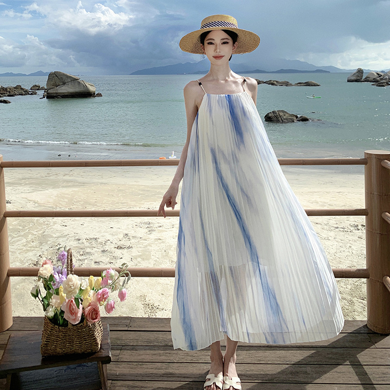 法式超仙蓝色晕染渐变吊带连衣裙女夏季海边度假风气质长裙