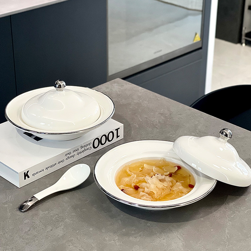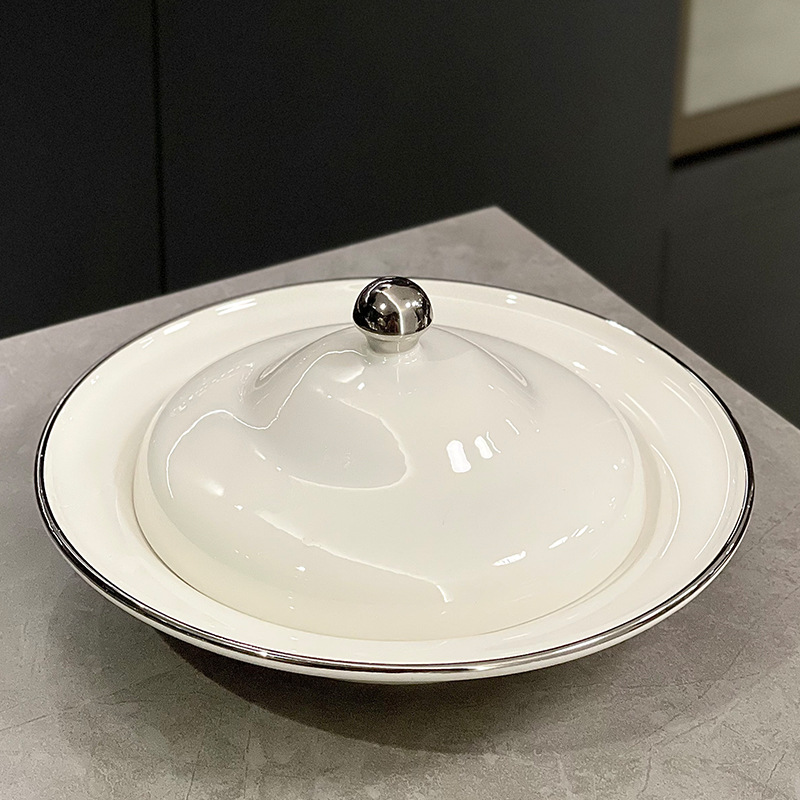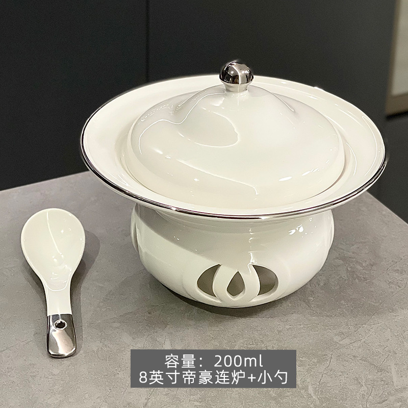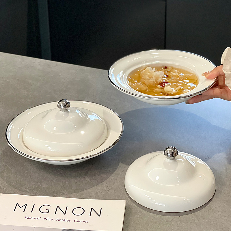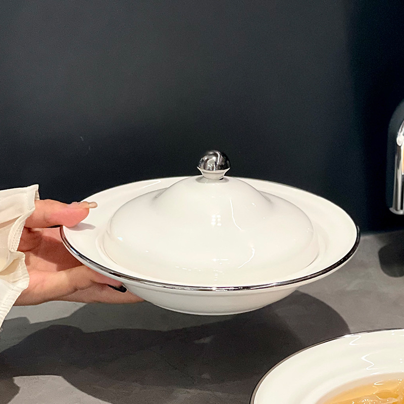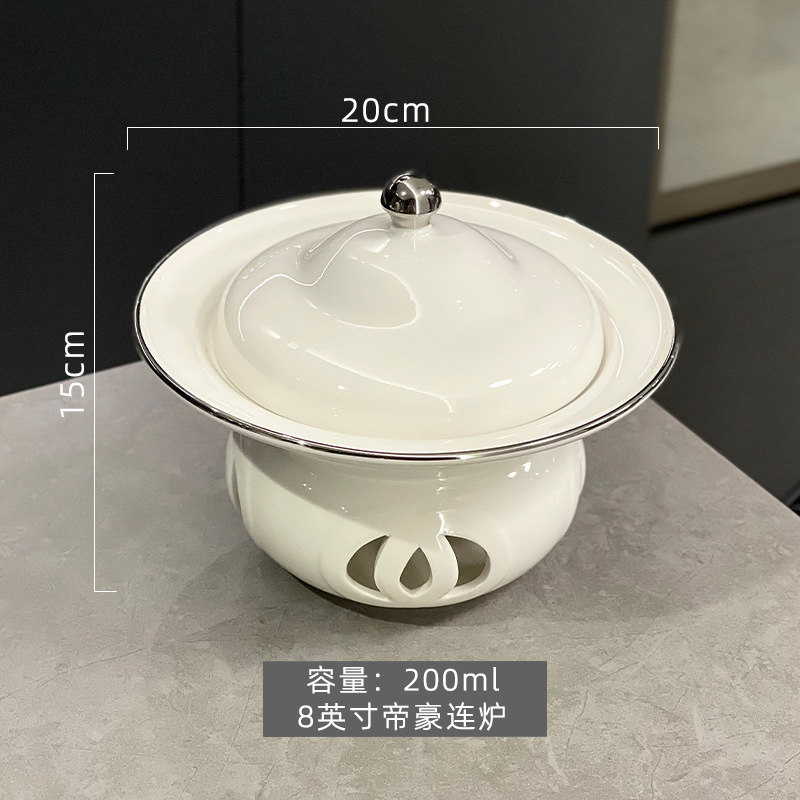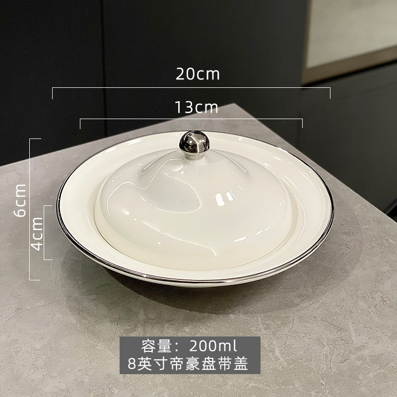 纯白色高颜值银边西餐盘碟带加热炉 高级感创意菜色盘陶瓷盘汤盘