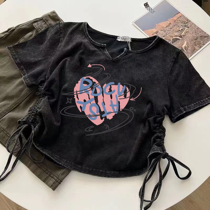 设计感爱心印花水洗黑做旧t恤女夏季短款抽绳小众百搭上衣情侣装