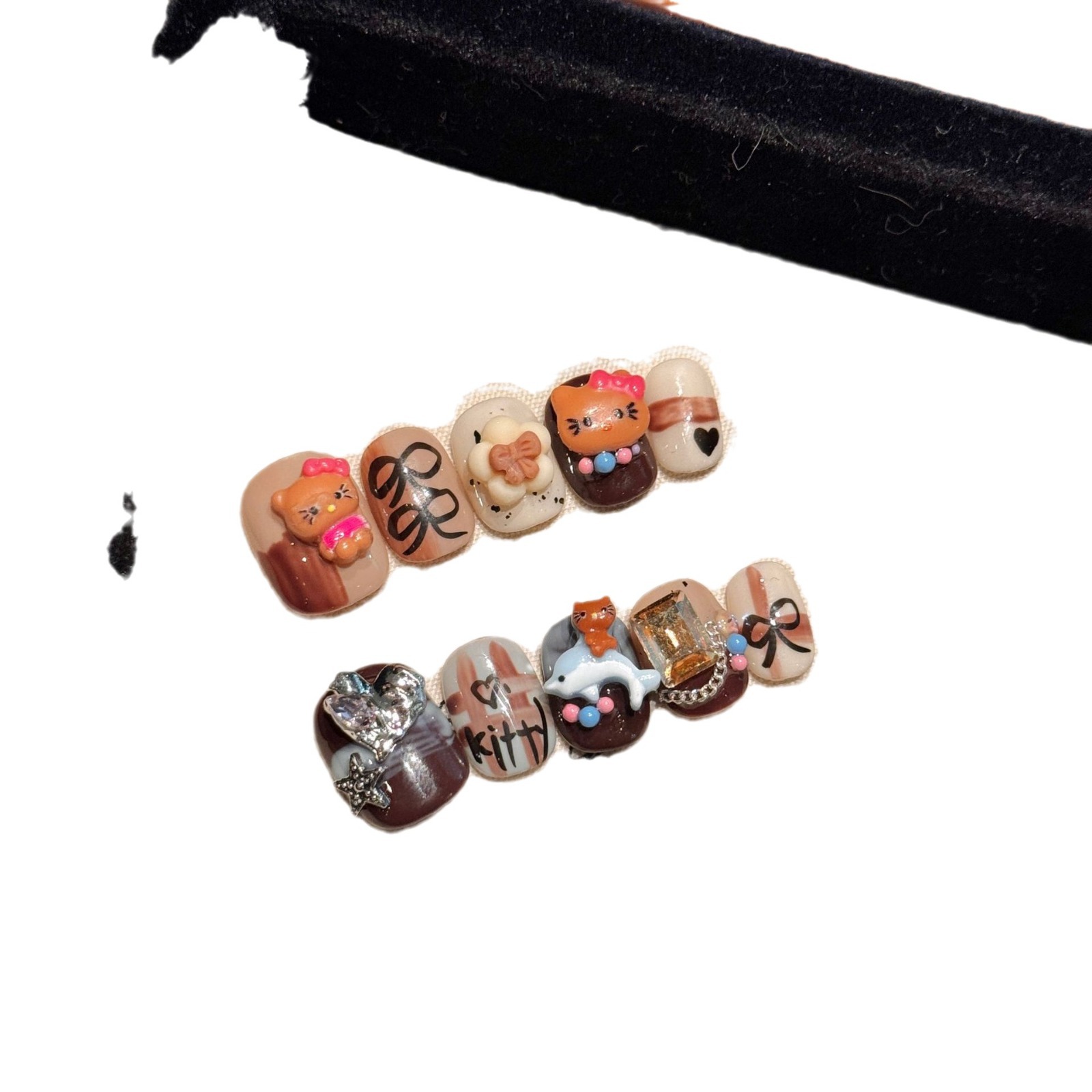 艺禾手工美甲纯手工假指甲秋冬美拉德风卡通蝴蝶结棕指甲短款可爱