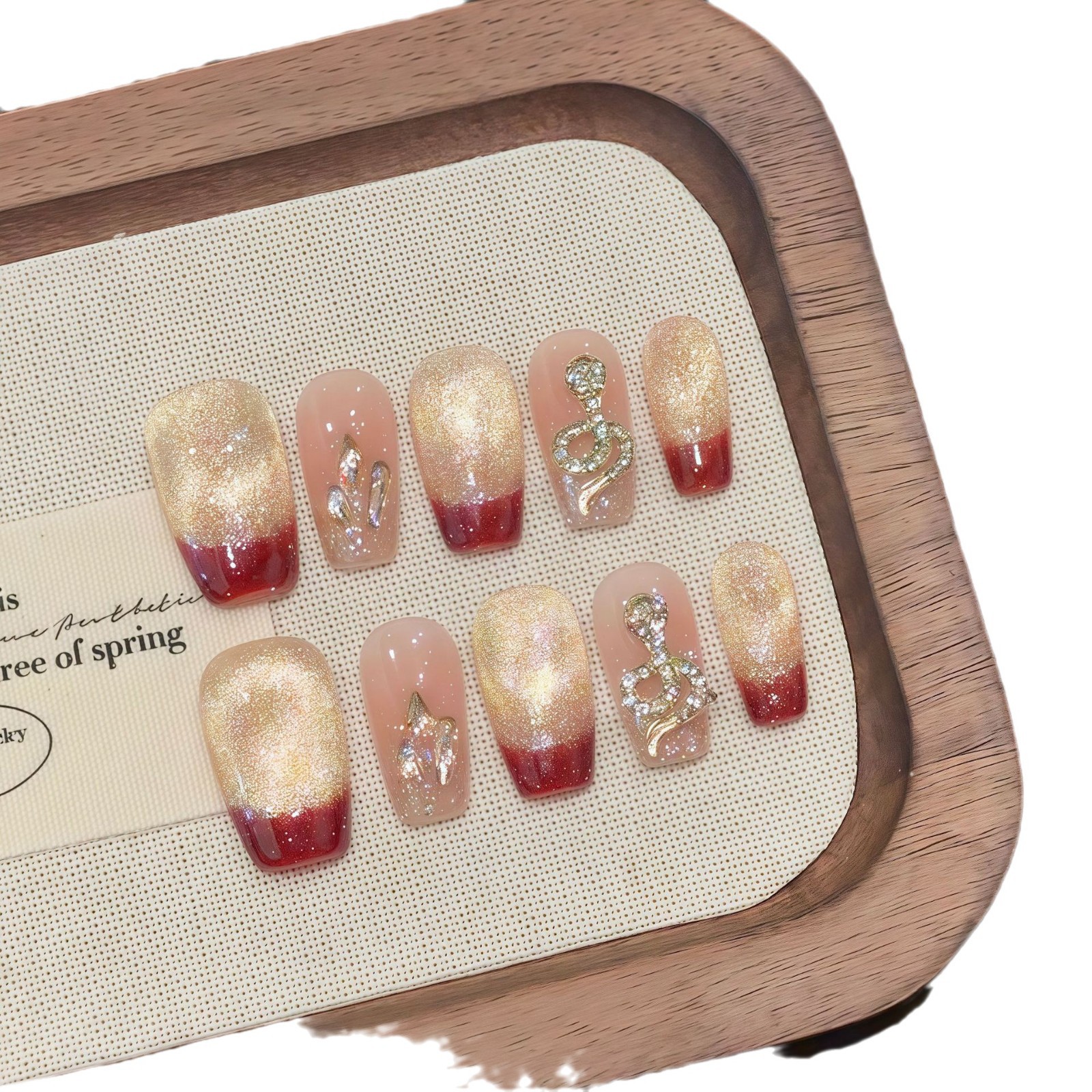 艺禾 红色法式烫金蛇高级感爆闪猫眼钻堆新年短款光疗穿戴甲