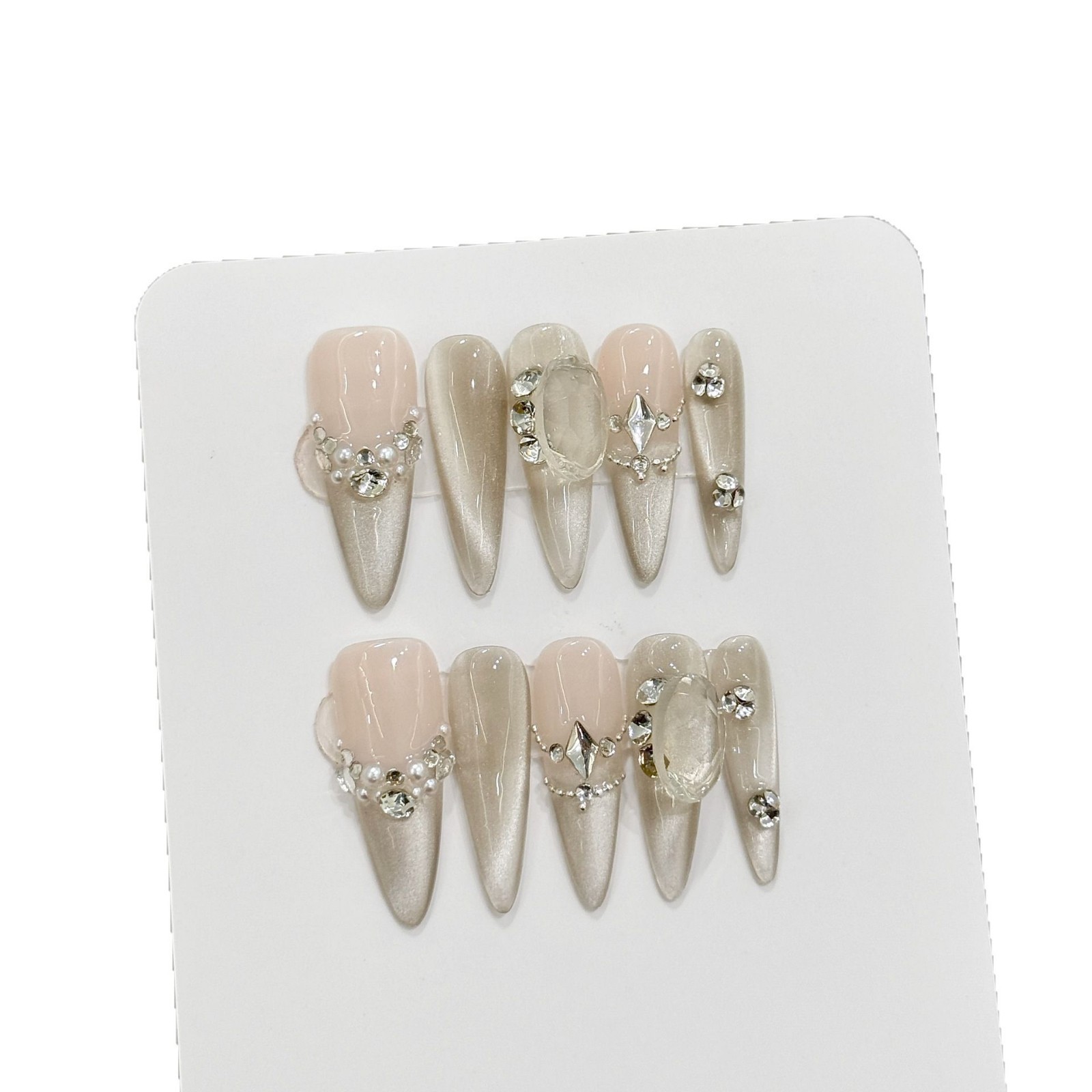 艺禾 宽光猫眼珍珠法式链条碎钻透底椭圆大钻怡梦纯手工穿戴甲