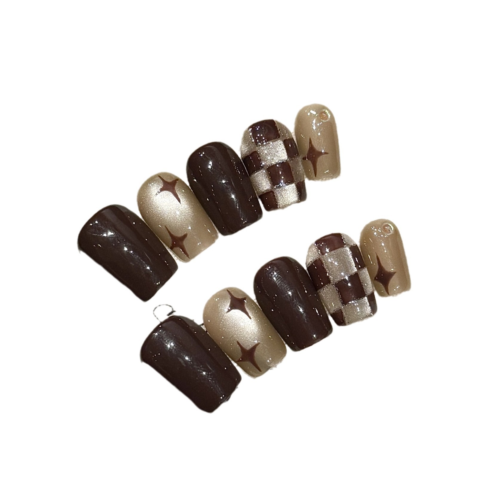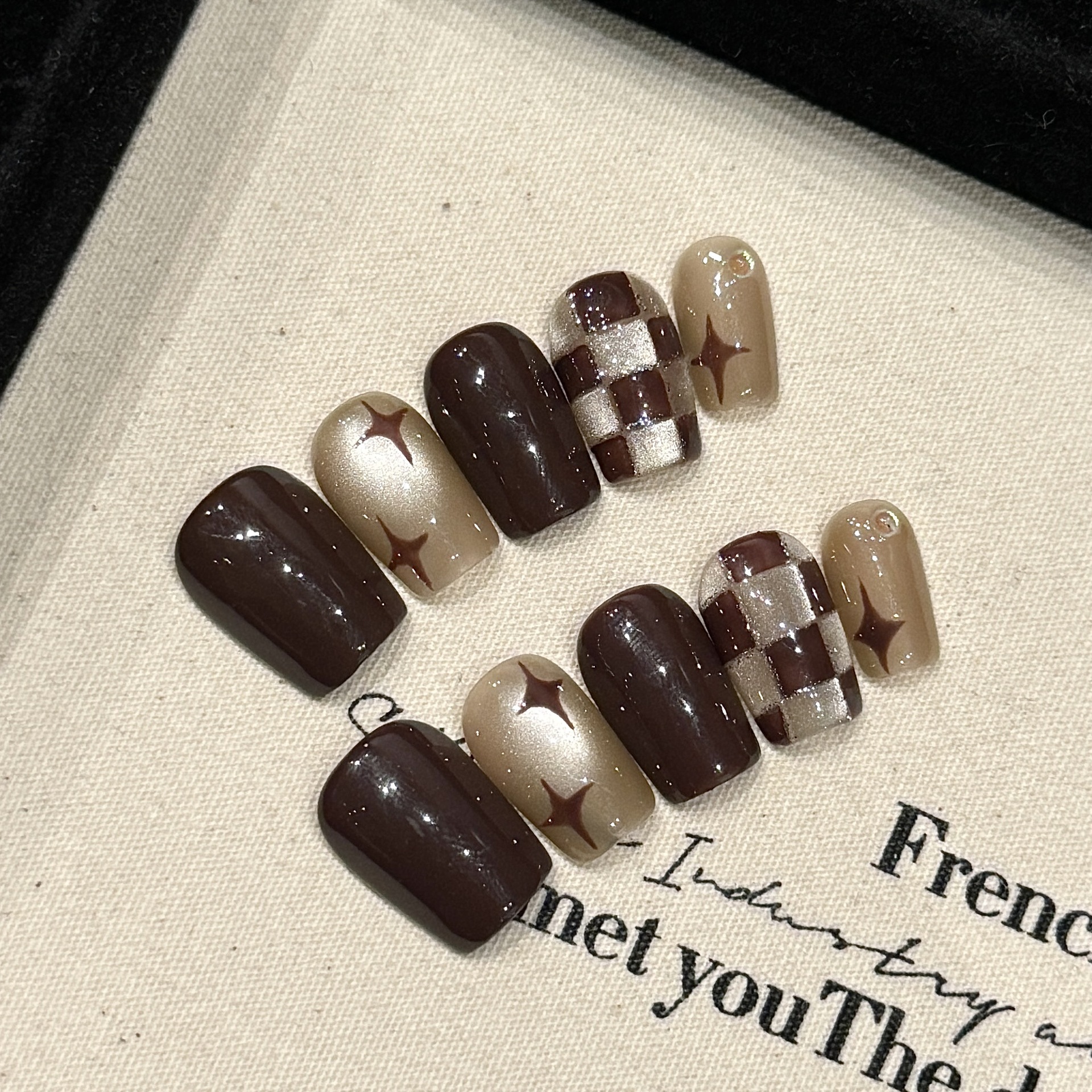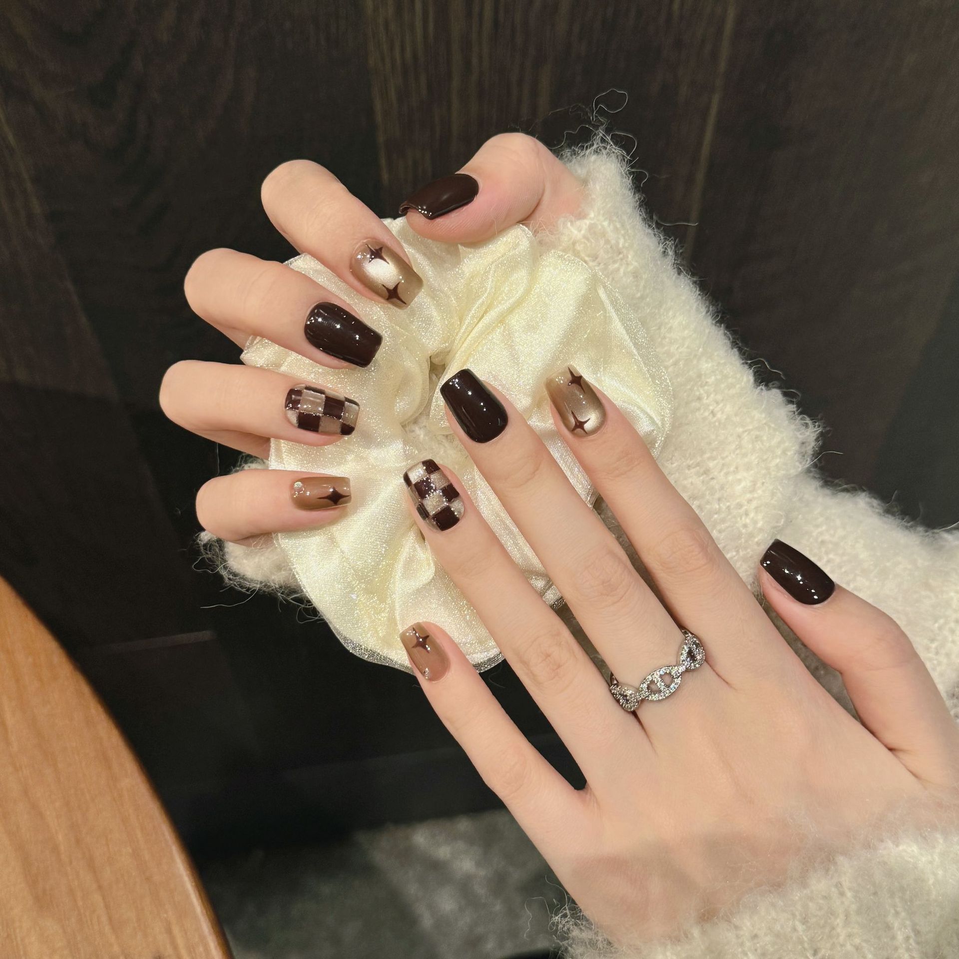 艺禾美甲 光疗美拉德色系棋盘格猫眼格纹星闪秋冬可拆卸美甲贴
