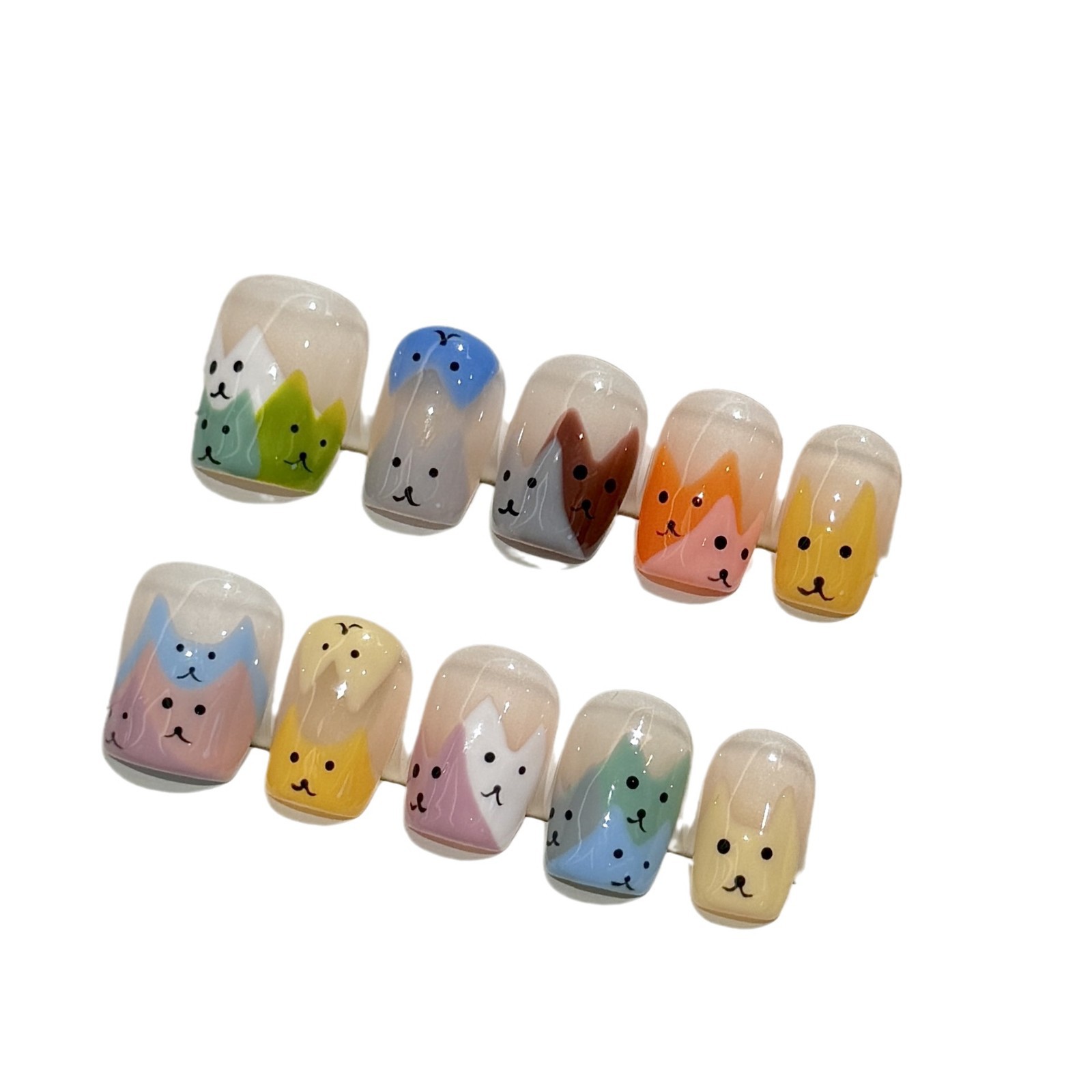 艺禾纯手工穿戴甲短款手绘卡通美甲贴片彩色可爱猫咪叠叠猫短款