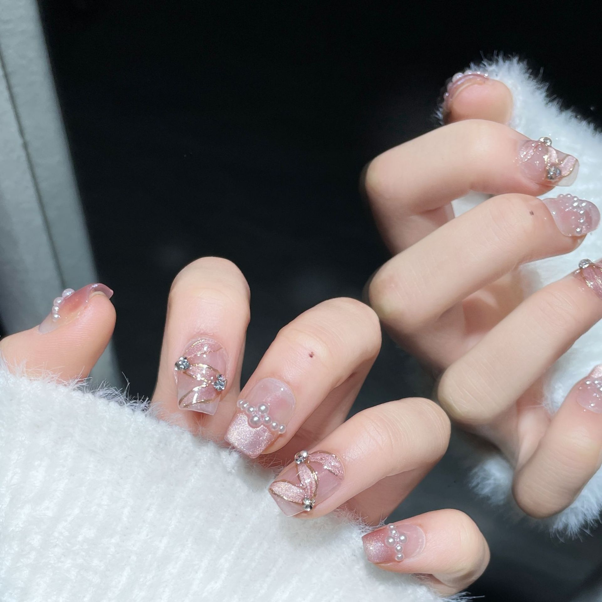 浪漫芭蕾纯手工穿戴甲手绘飘带珍珠猫眼秋冬爆款气质显白高级