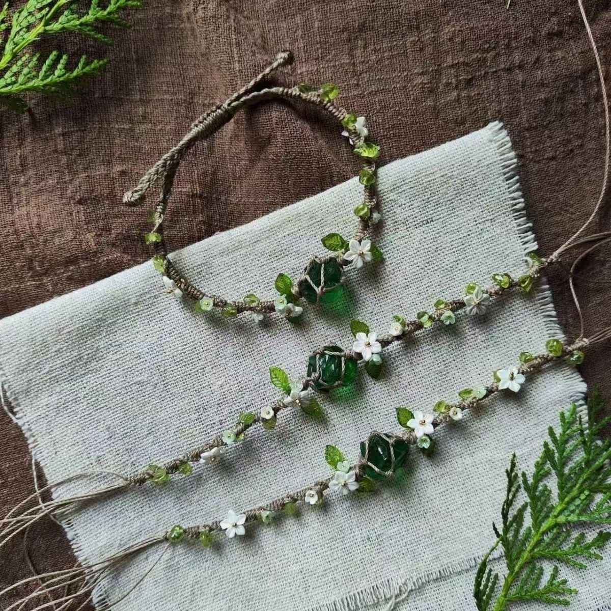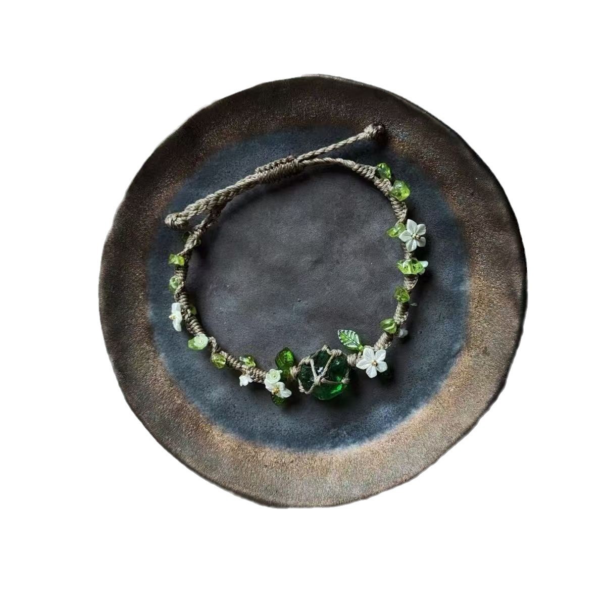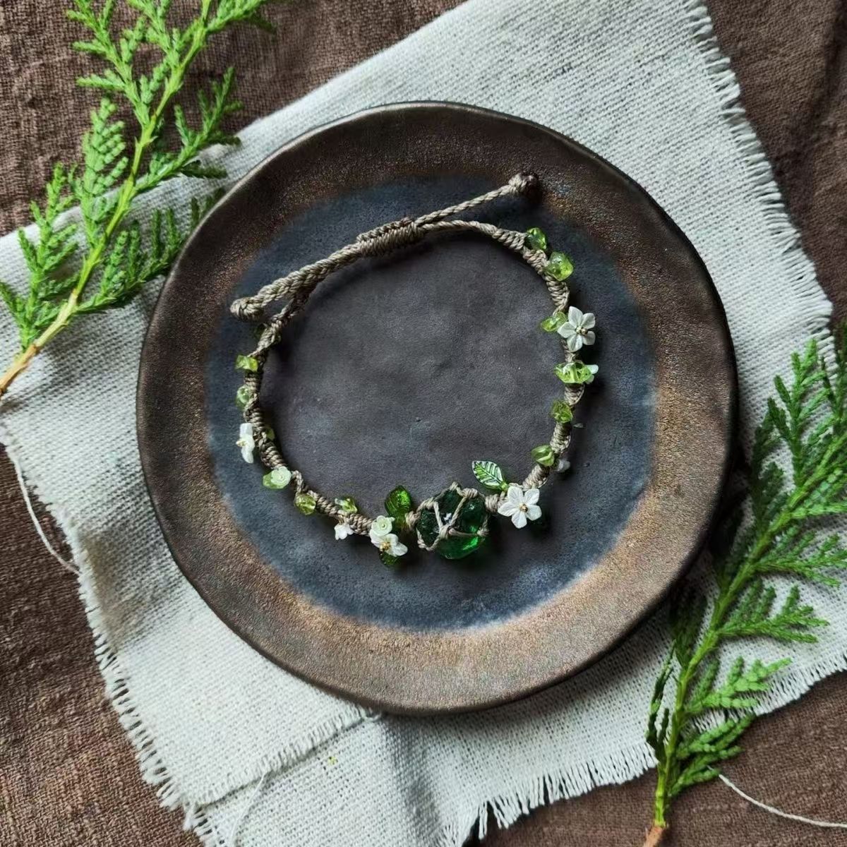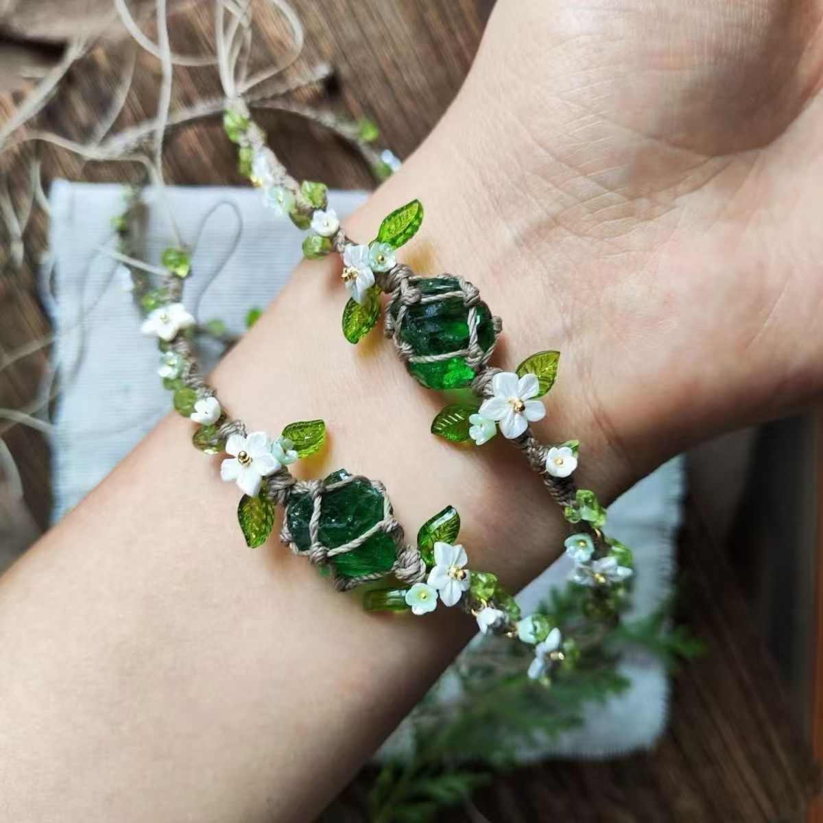 macrame合成水晶橄榄石纯手工编织网兜森系手绳琉璃花环手链礼物