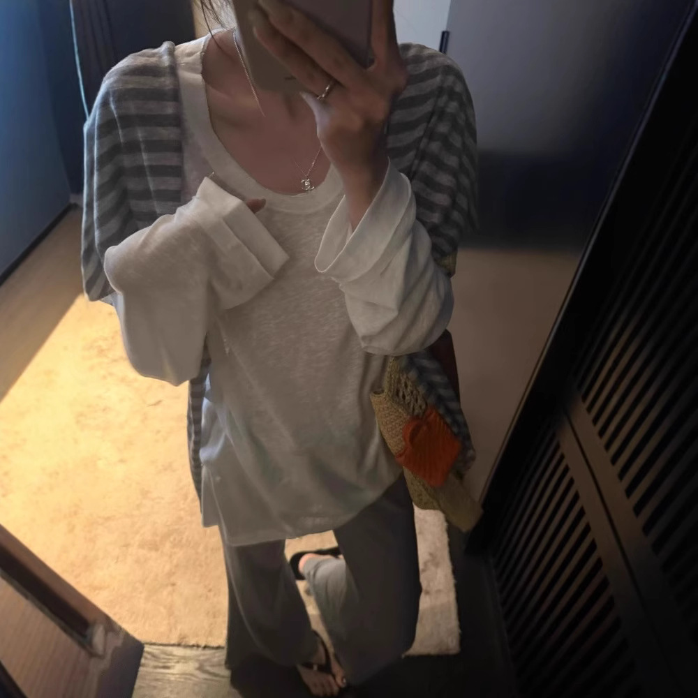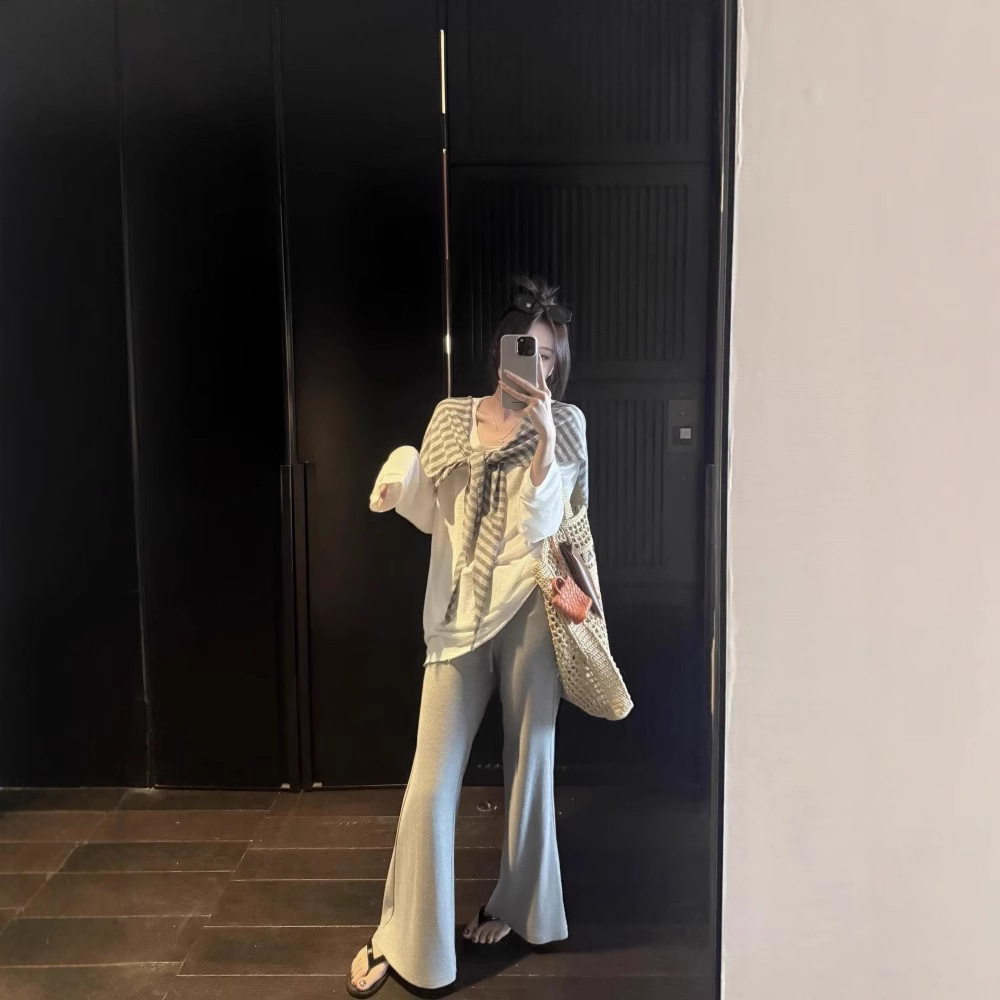 韩系御姐套装女宽松白色t恤一整套ootd穿搭新款条纹披肩微喇裤潮