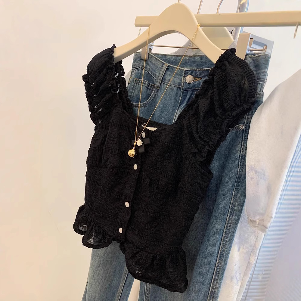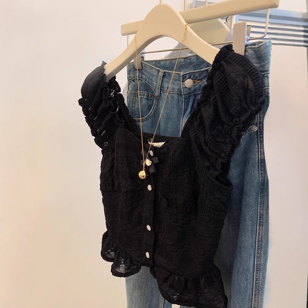 法式绝美设计黑色蕾丝吊带宽肩带背心无袖上衣女外穿独特精致小衫