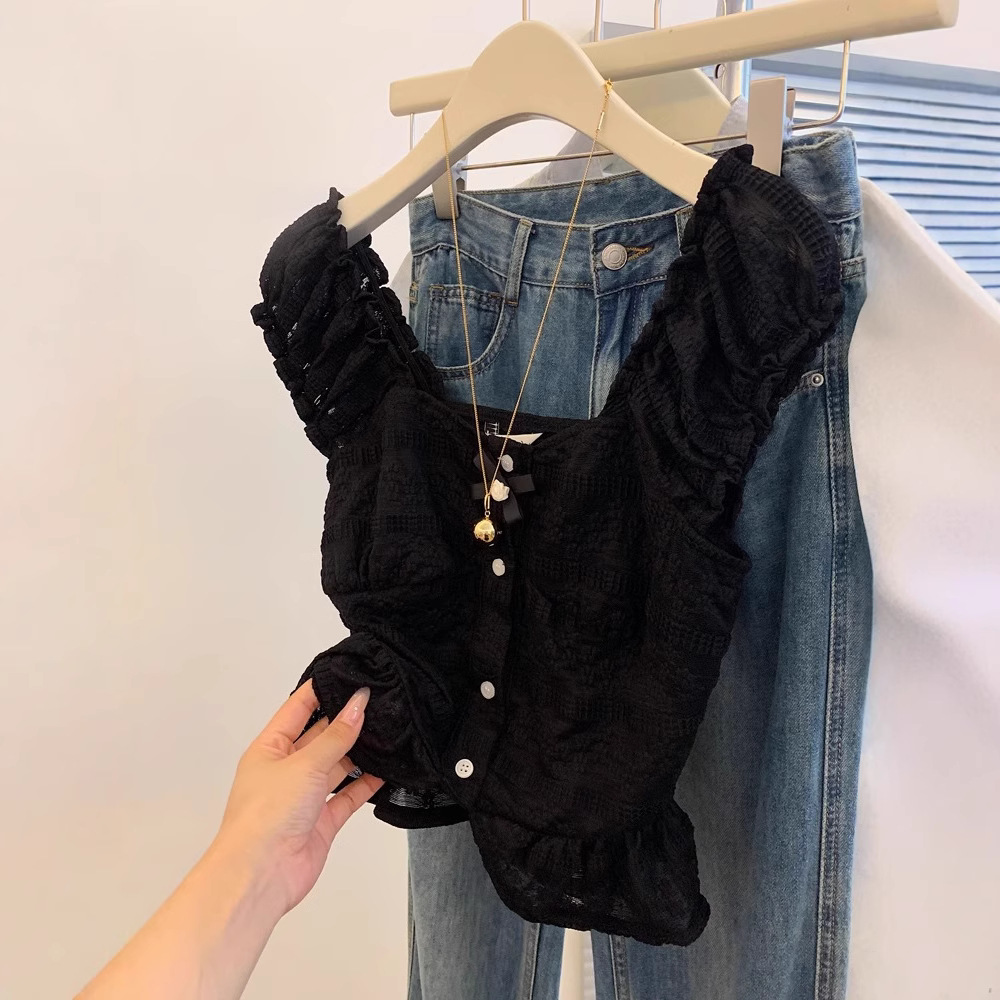 bm甜辣妹假两件短袖T恤纯欲拼色半开领蕾丝花边修身显瘦夏季上衣