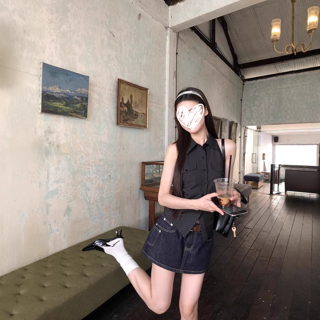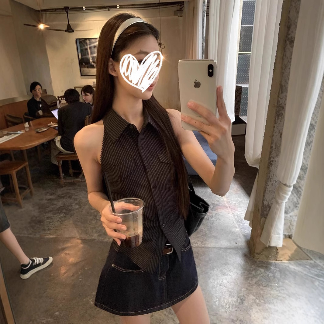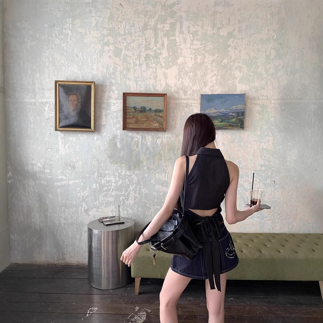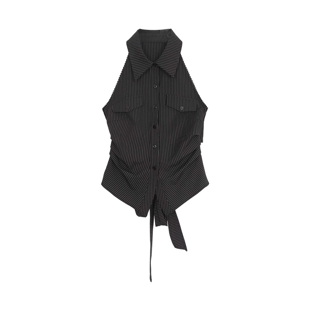 黑色条纹翻领坎肩无袖马甲背心女春夏时尚辣妹露背系带蝴蝶结上衣