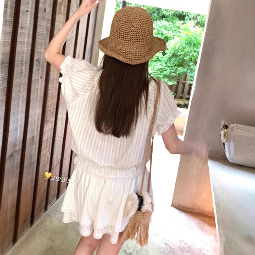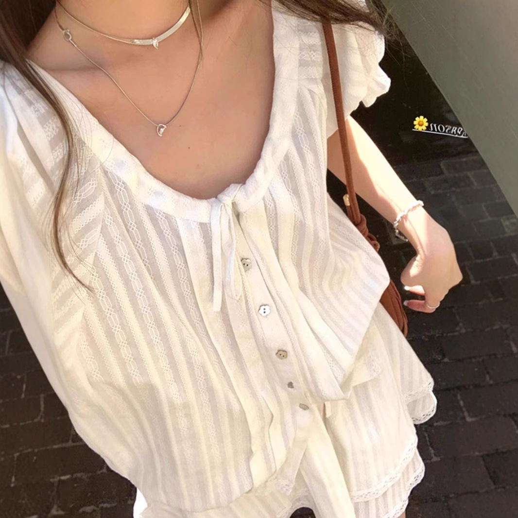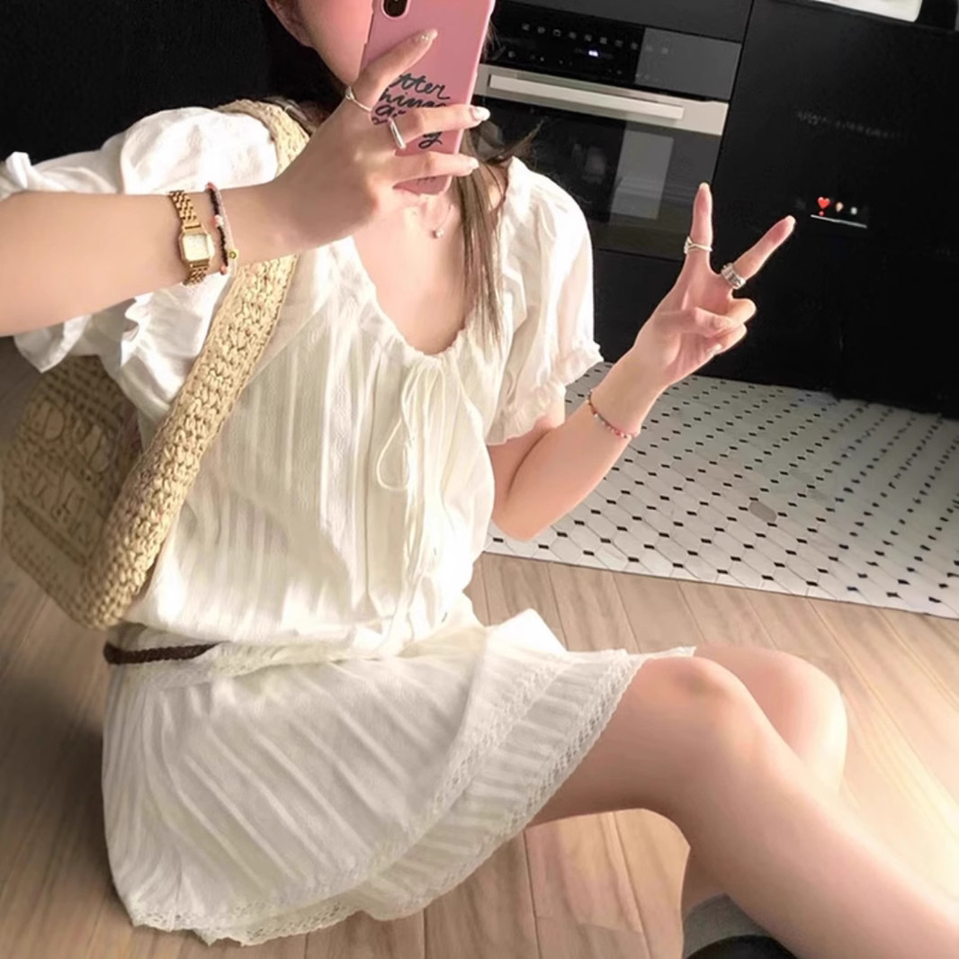 白色U领绑带泡泡袖上衣女夏蕾丝边百搭半身裙套装两件套