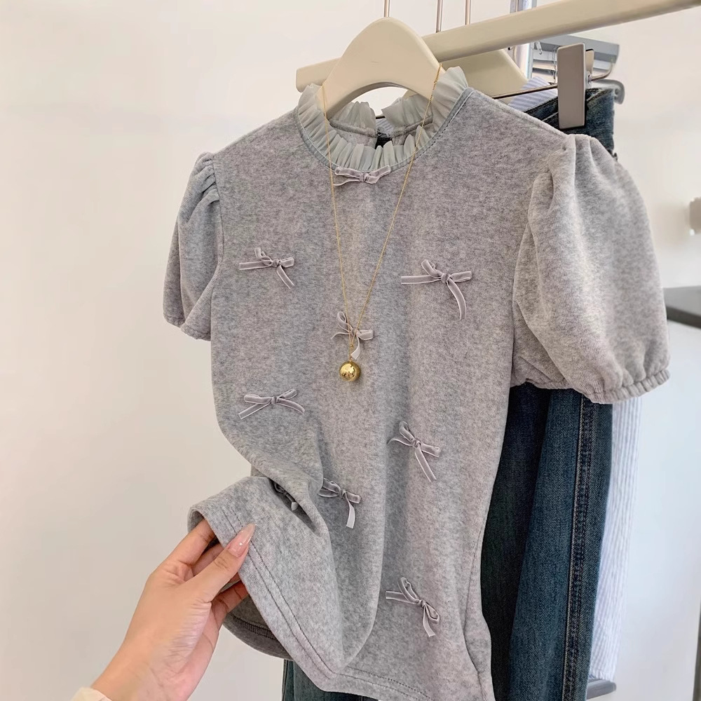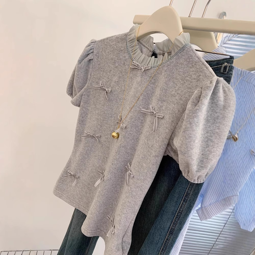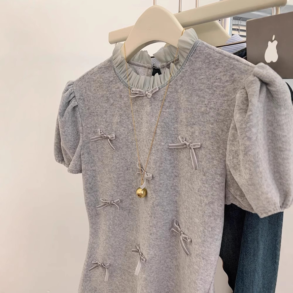 蝴蝶结灰色短款修身正肩t恤女小个子显瘦设计感上衣针织泡泡短袖