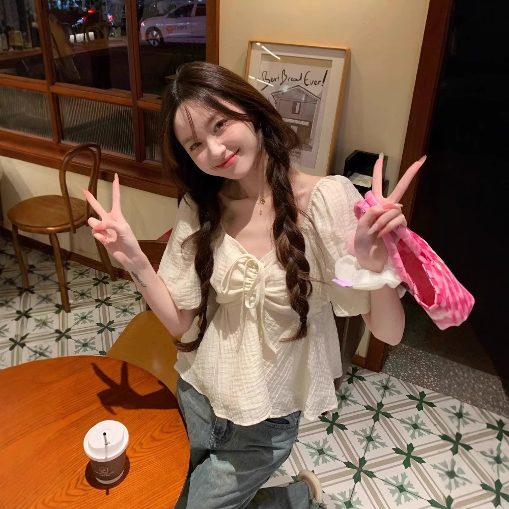 一字肩短款上衣女夏款小众甜美方领高级感法式温柔风泡泡短袖衬衫