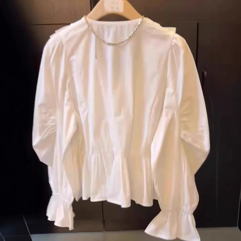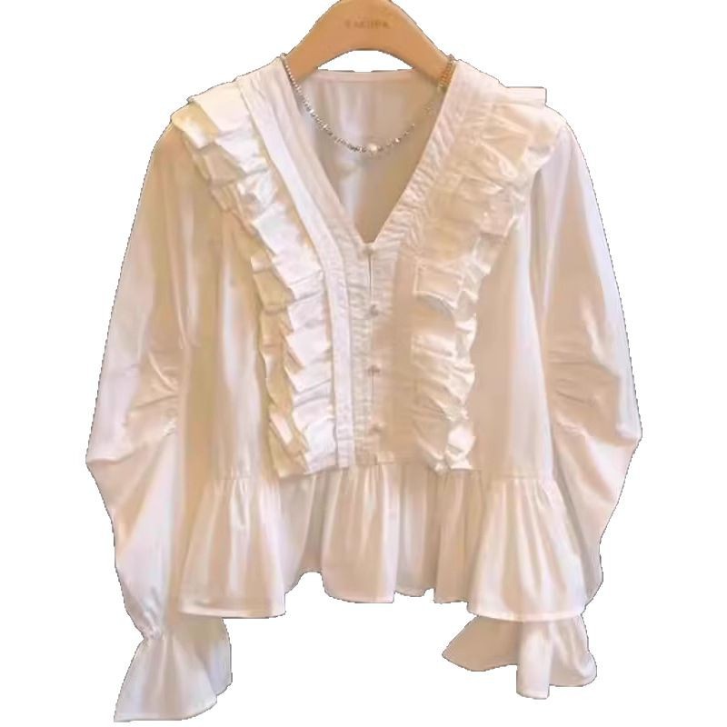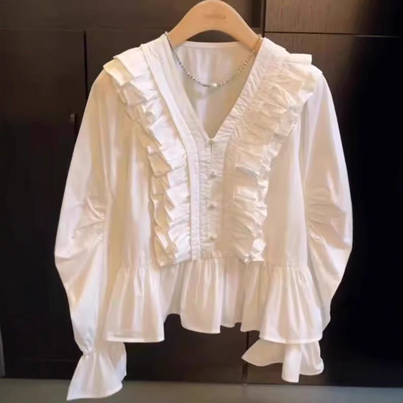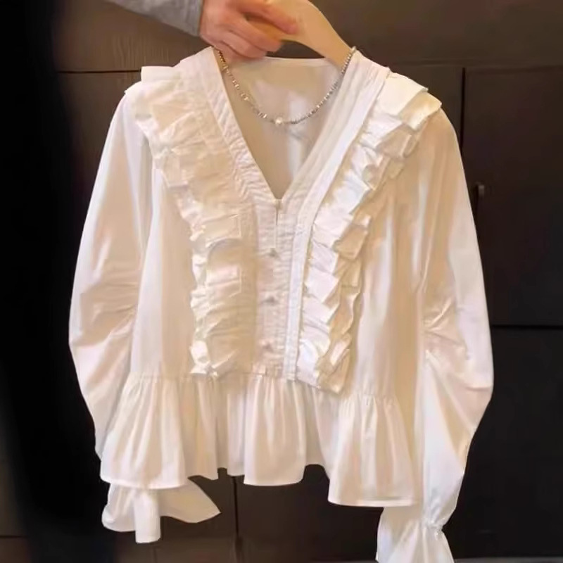 重工荷叶边V领高级感衬衫女2025夏季新款小众设计感百搭洋气上衣