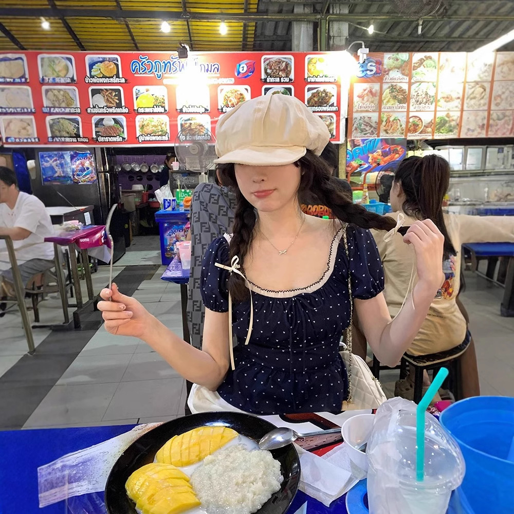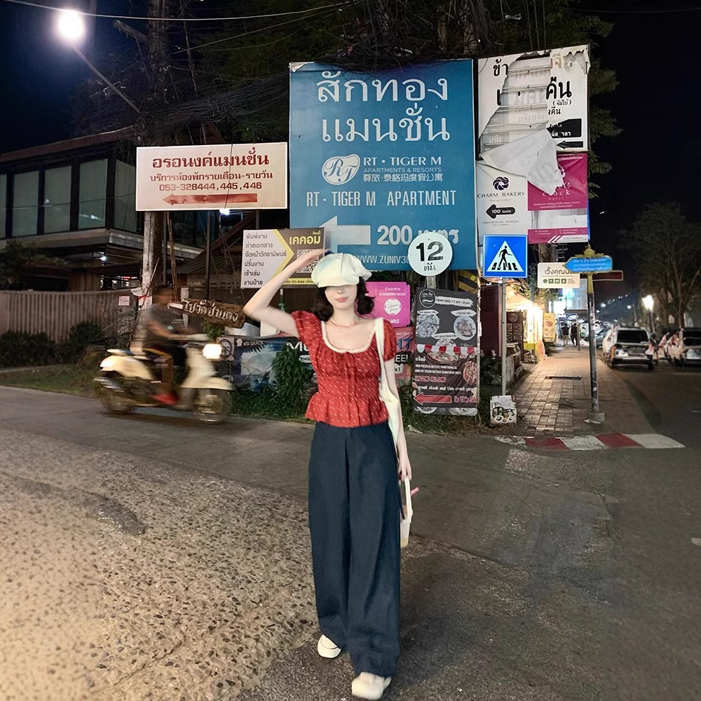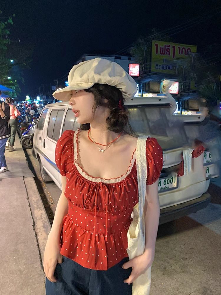 珍妮桃心爱心波点撞色花边方领短袖t恤女夏泡泡袖短款上衣