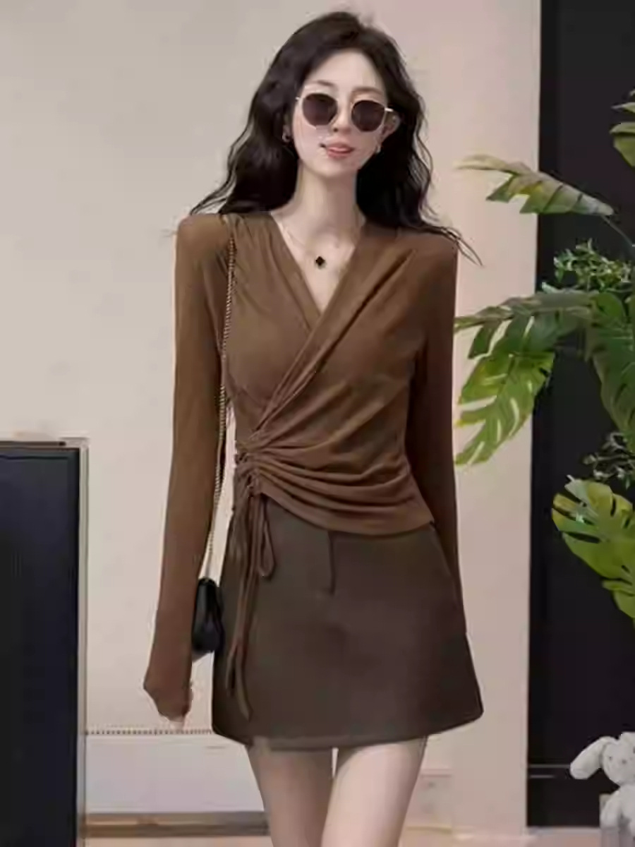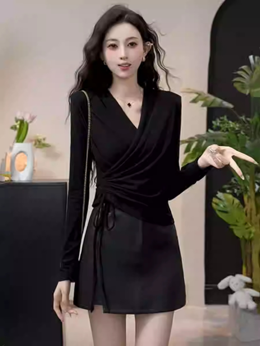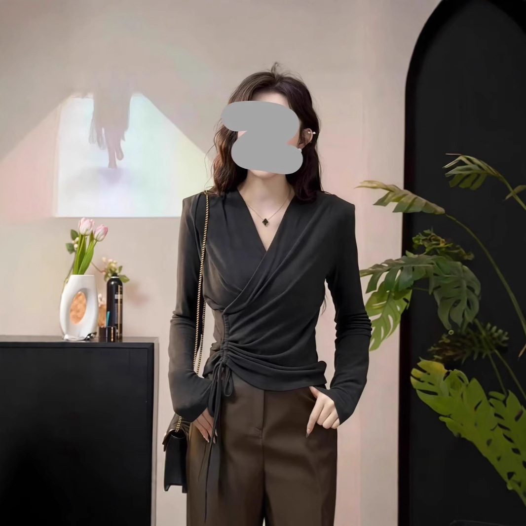 法式不规则褶皱v领打底衫t恤女新款秋冬短款高级感辣妹修身上衣