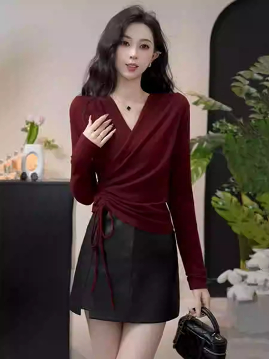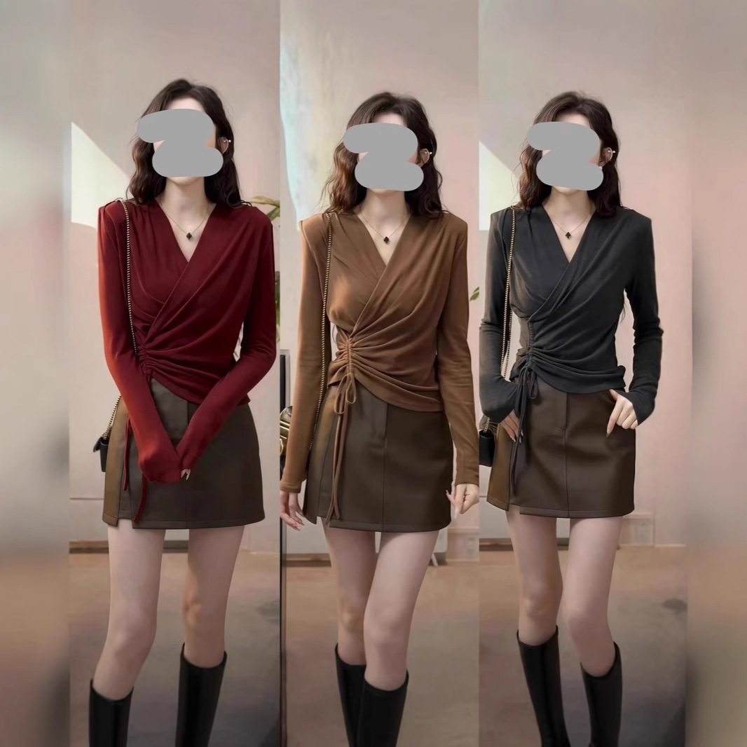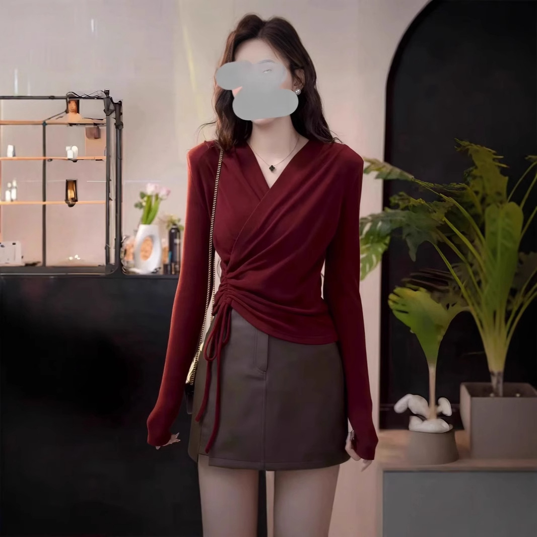 法式不规则褶皱v领打底衫t恤女新款秋冬短款高级感辣妹修身上衣