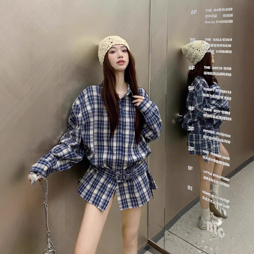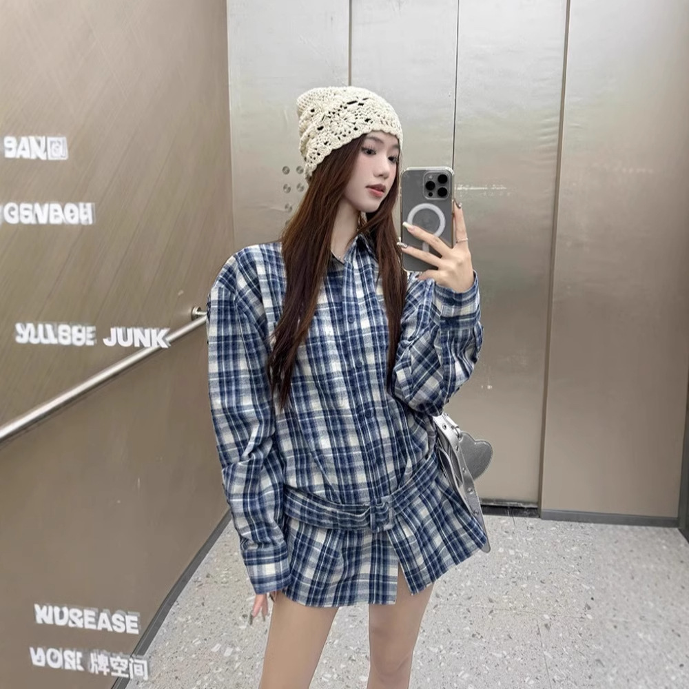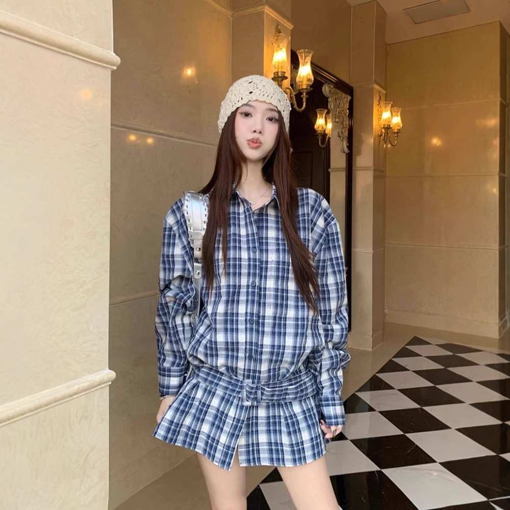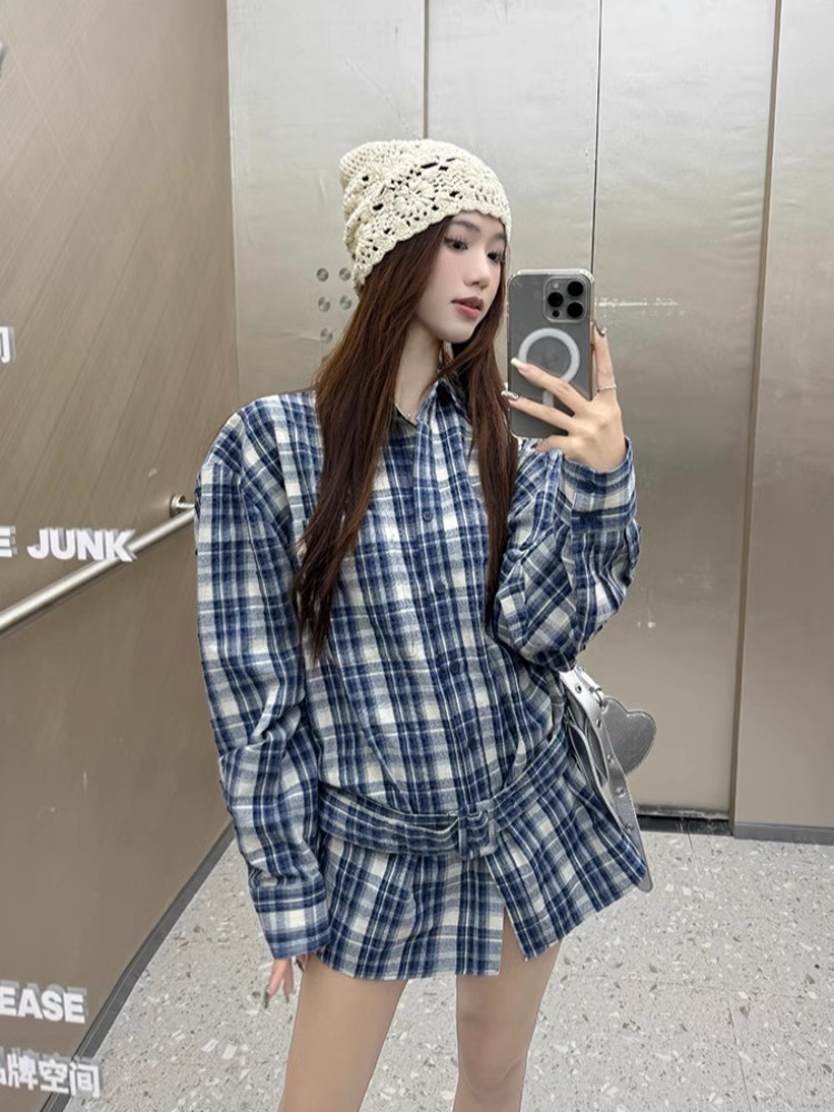 复古港味蓝色格子衬衫女春秋新款设计感小众宽松上衣长袖衬衣外套
