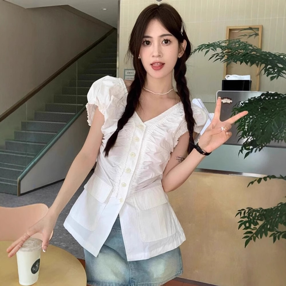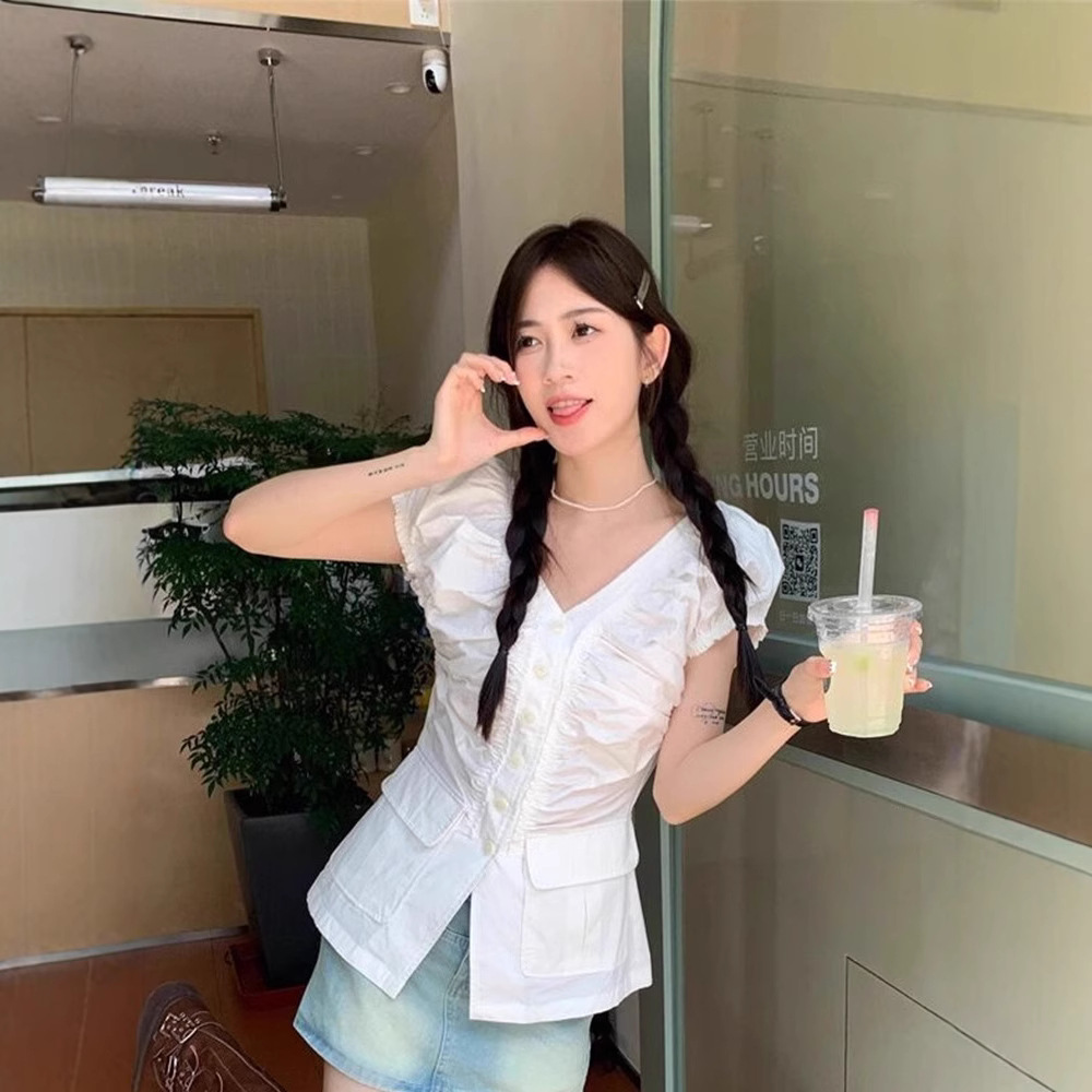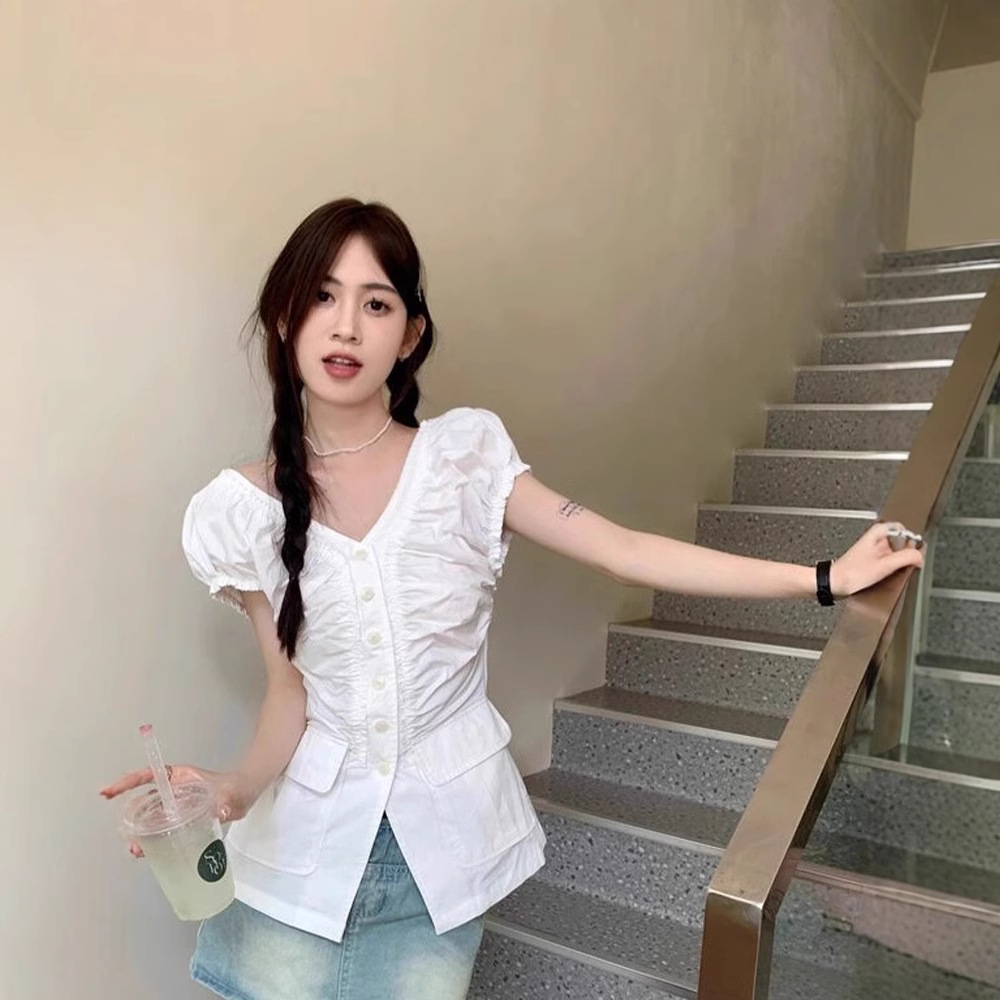 大码胖mm法式白色正肩短袖衬衫女夏季修身收腰v领设计感小众上衣