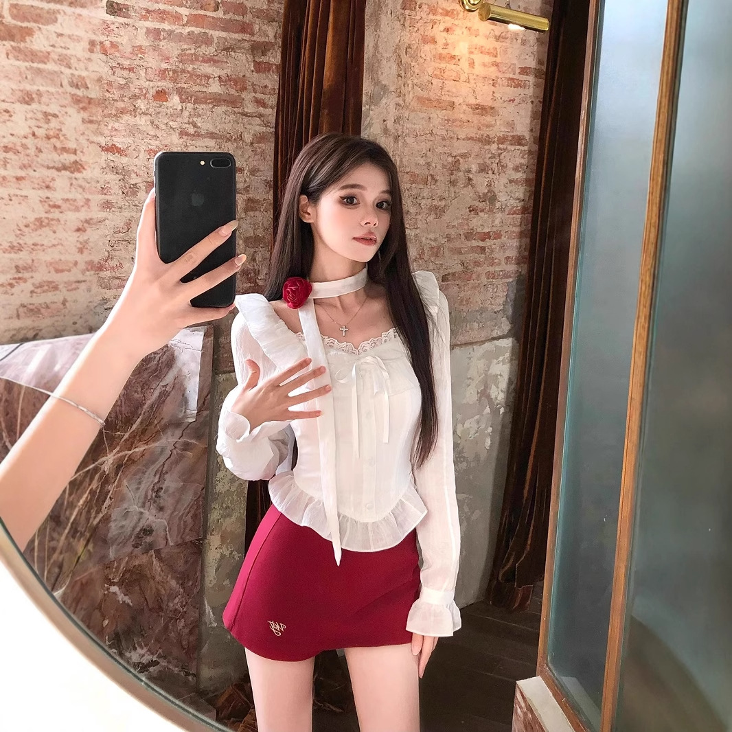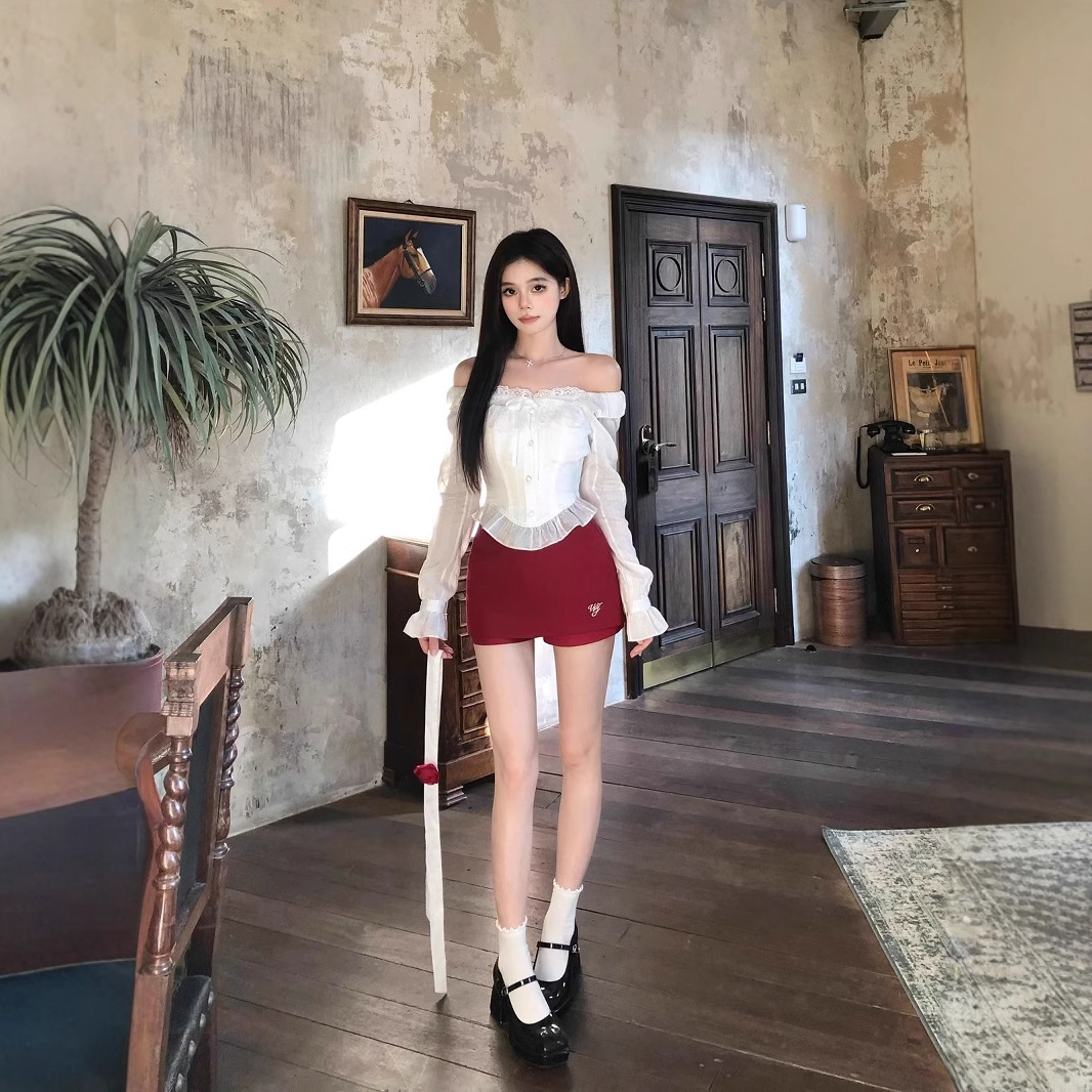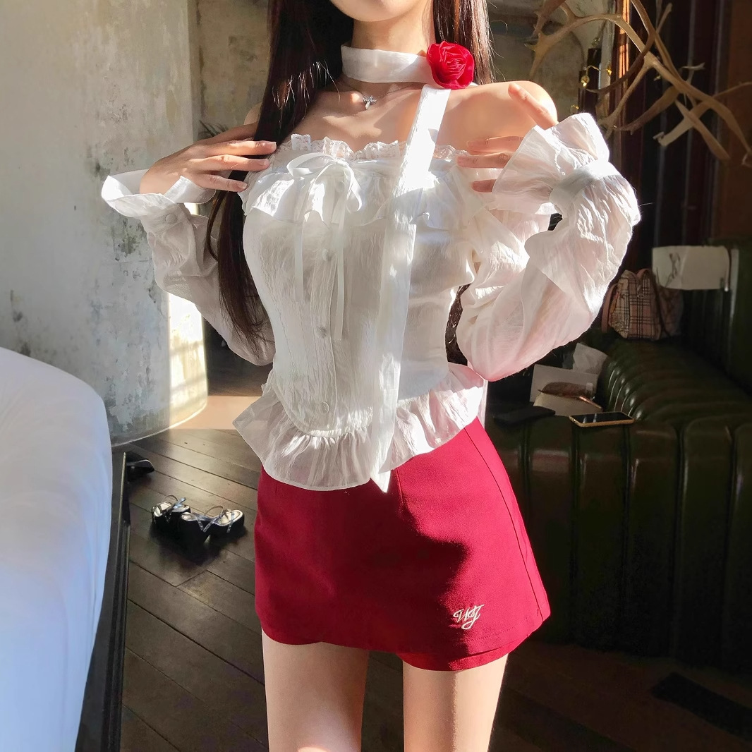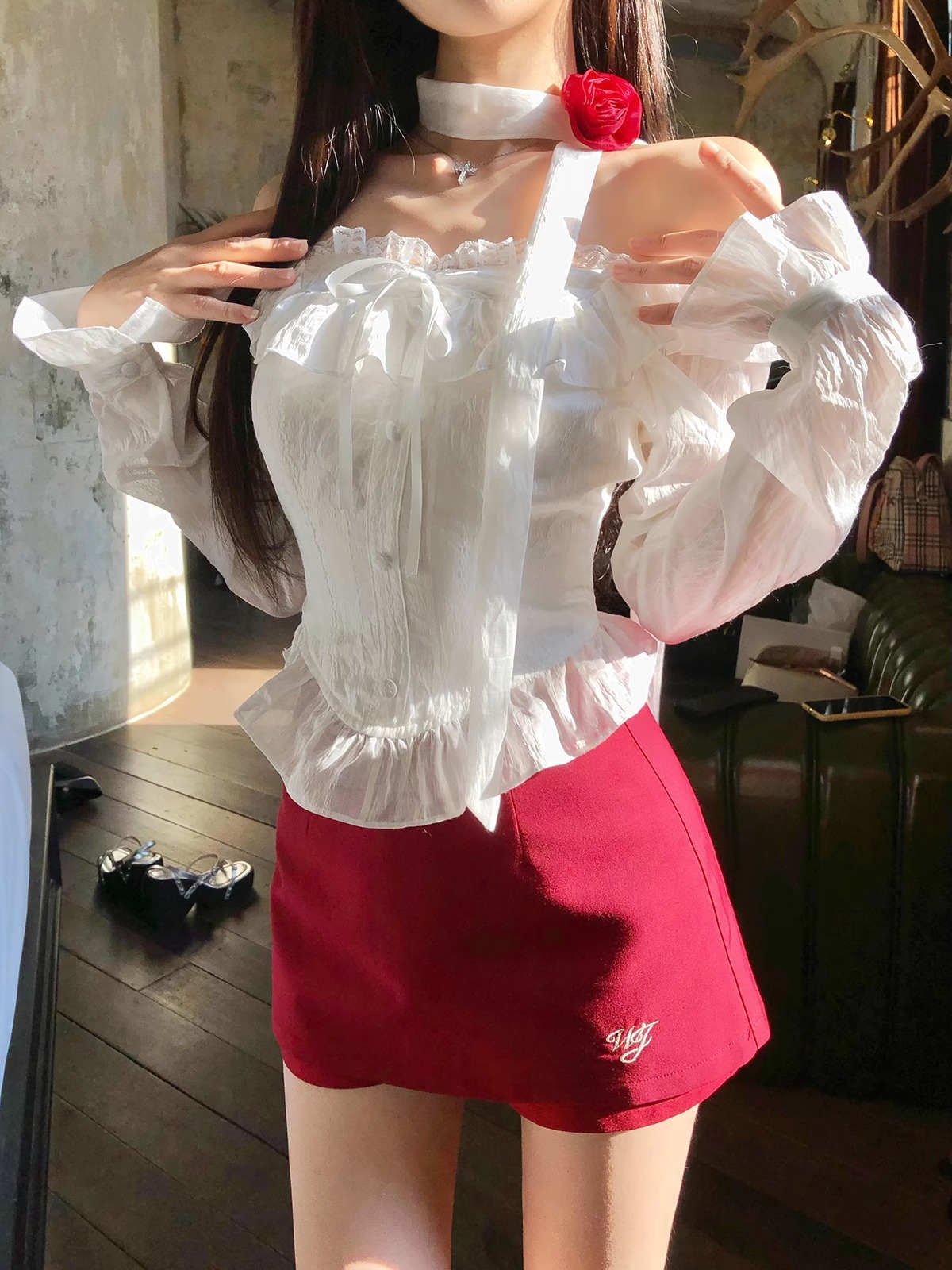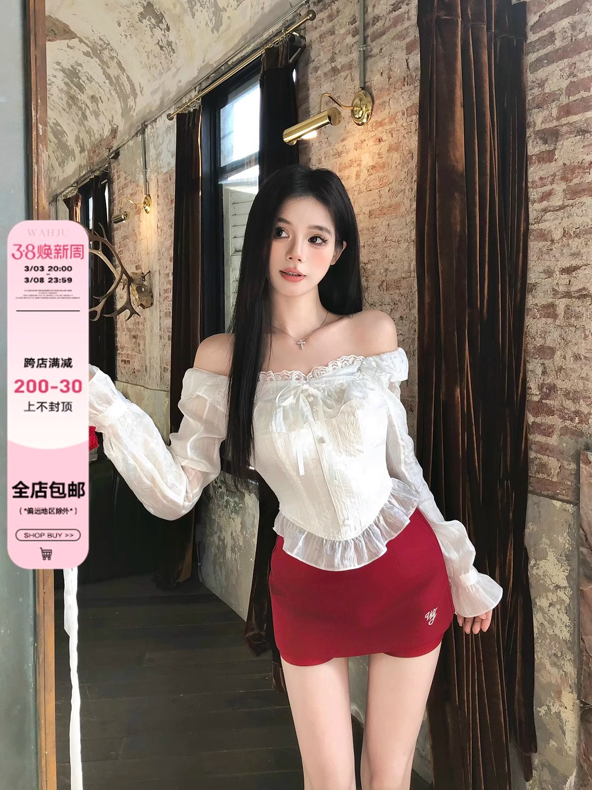 炽热红玫 气质时尚短款蕾丝衫女春季新款露肩性感上衣短裙两件套