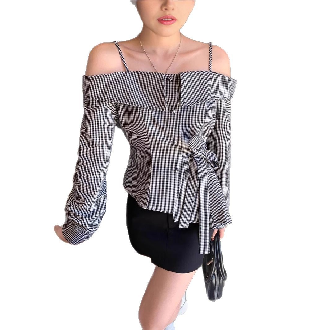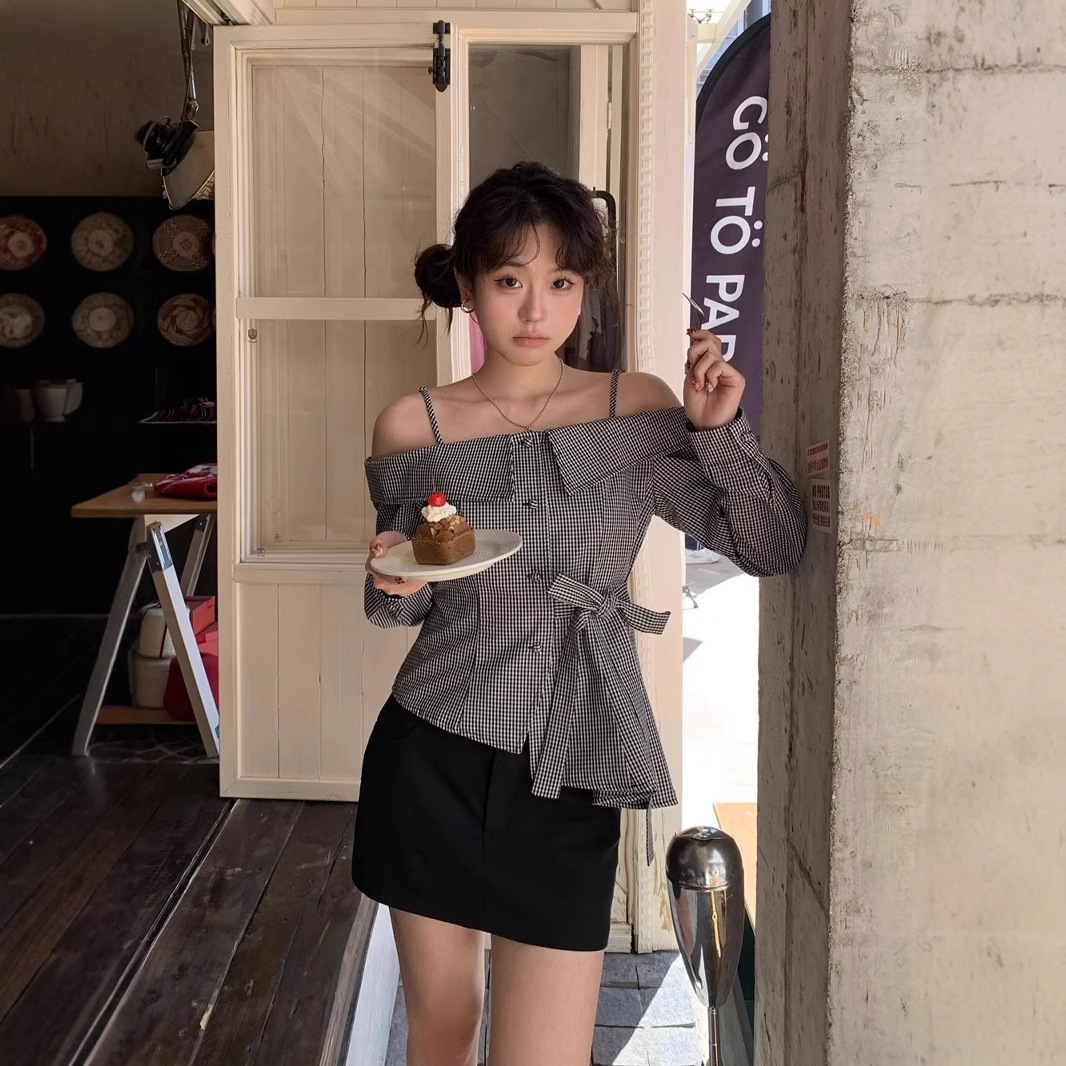 法式荷叶边吊带衬衫女春秋纯欲一字肩独特别致绝美露肩绑带衬衣潮