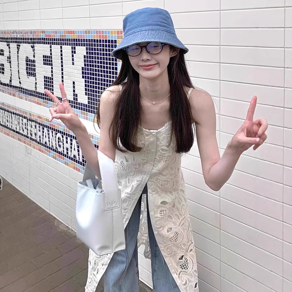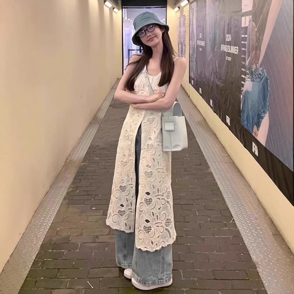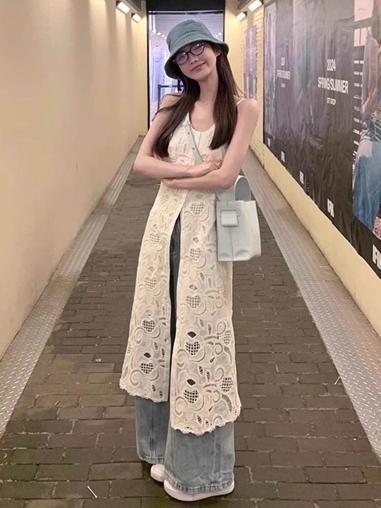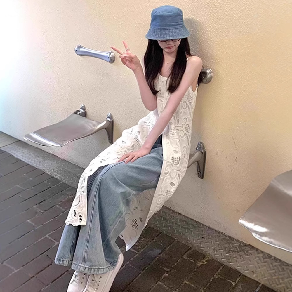 法式镂空钩花背心连衣裙女开叉叠穿设计感春夏季新款无袖罩衫长款