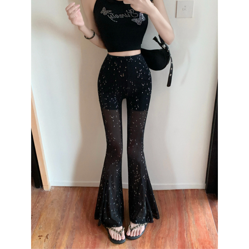 性感闪闪烫钻微透网纱微喇裤女春季2025新款修身高腰显瘦走秀长裙