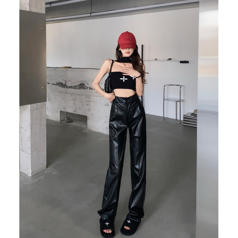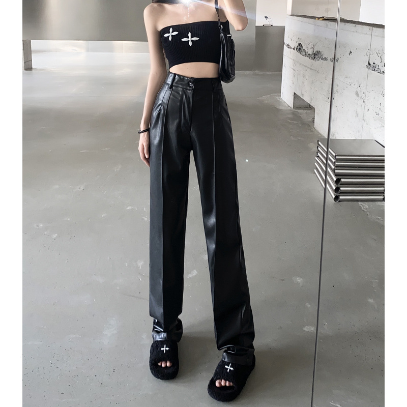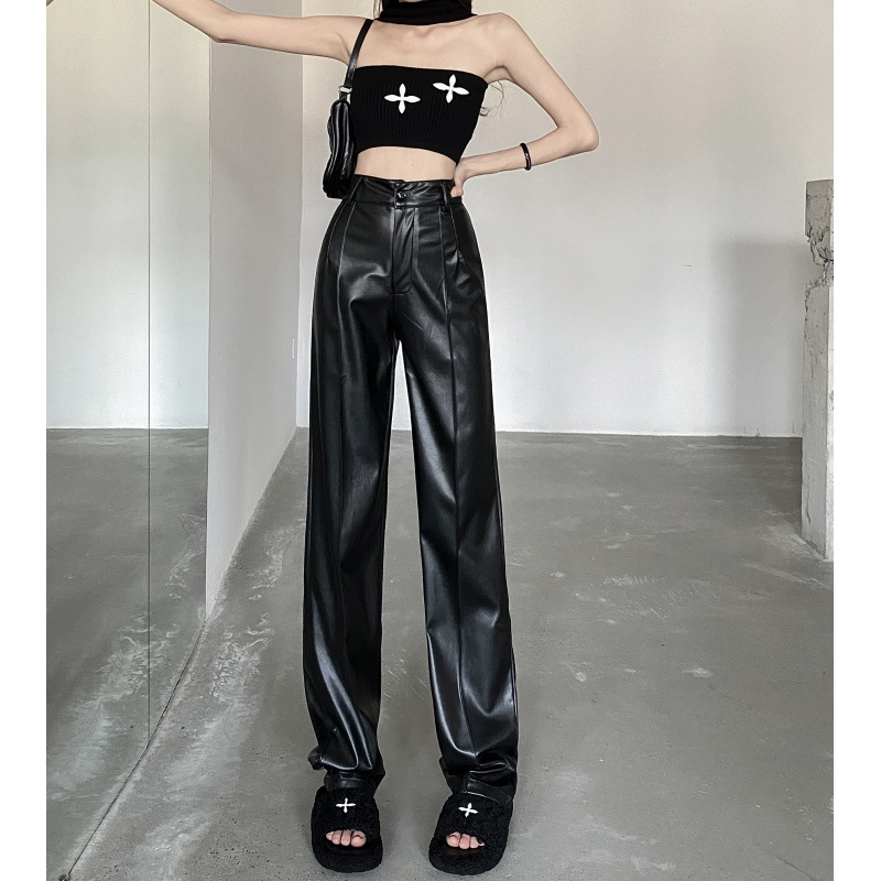 实拍实价现货高腰显瘦紧身黑色皮裤女高级感垂感休闲直筒阔腿长裤