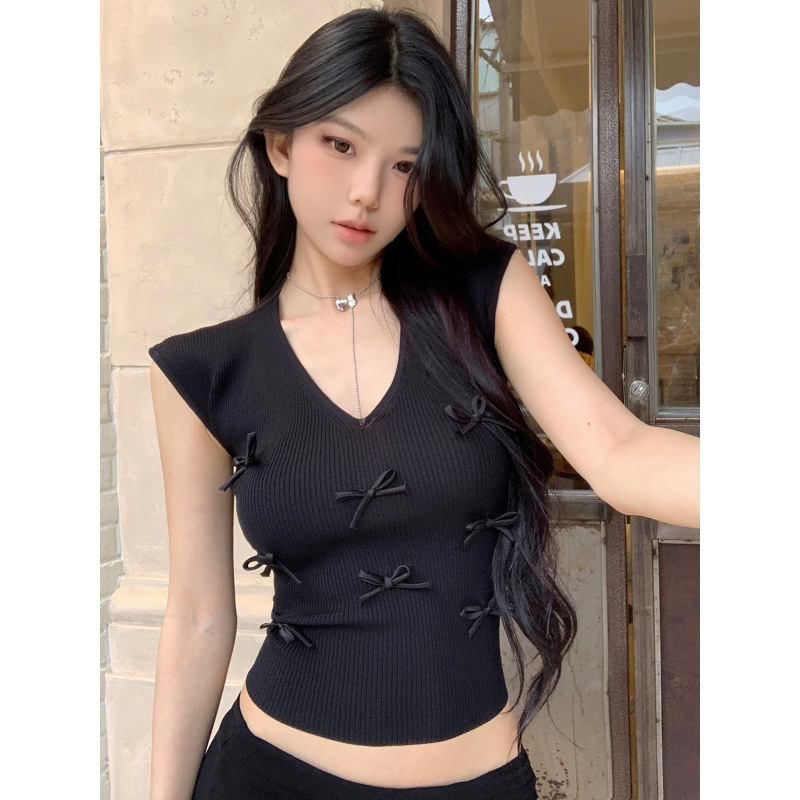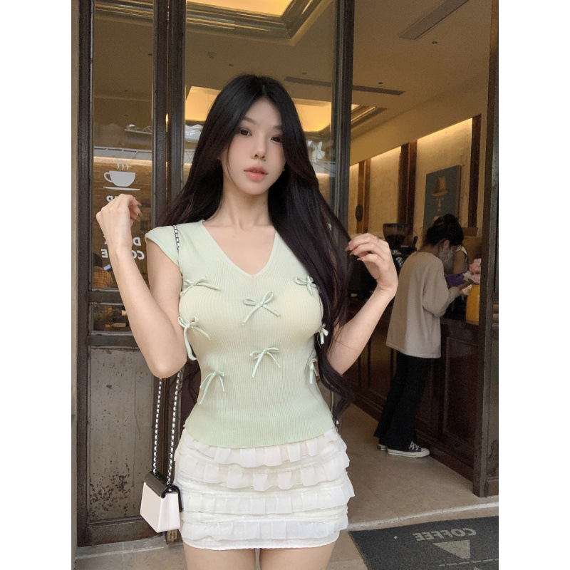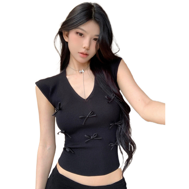 甜美芭蕾风立体蝴蝶结V领短袖T恤女夏季