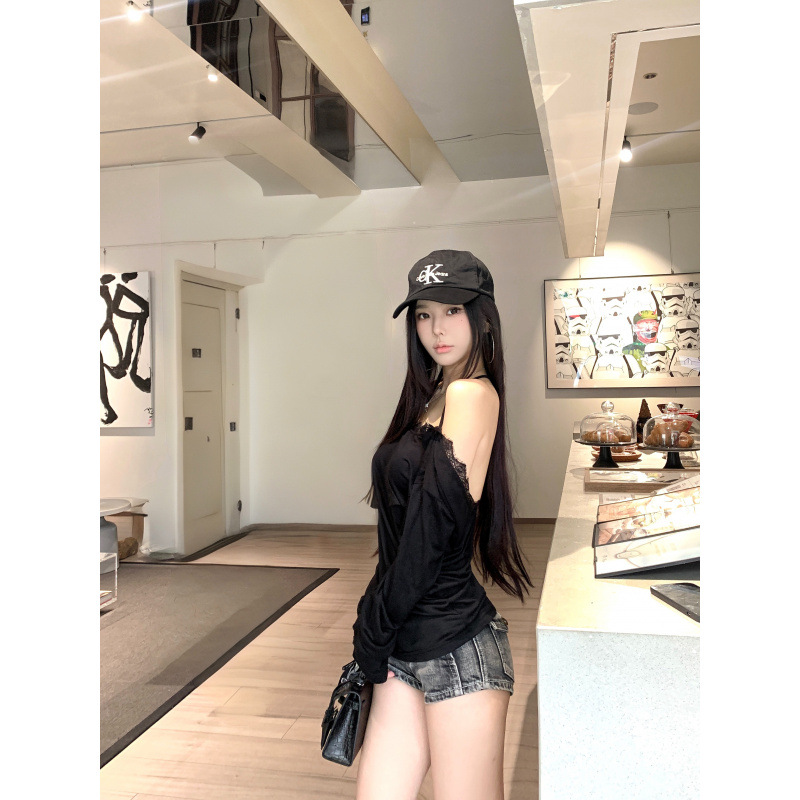 同行盗图必究,蕾丝花边v领长袖T恤女宽松休闲打底衫上
