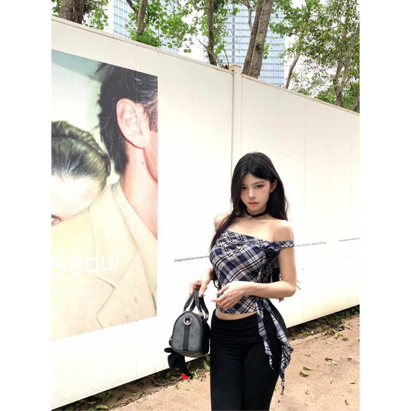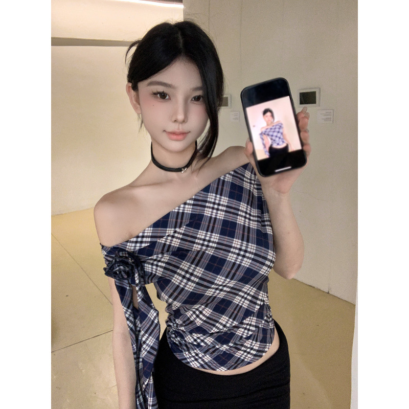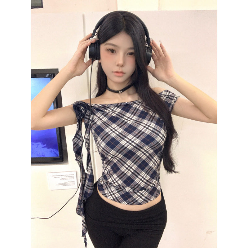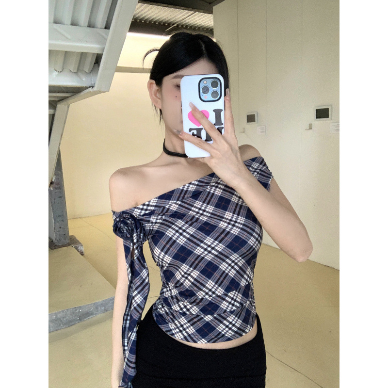 实拍实价 辣妹复古格子短袖修身显瘦一字